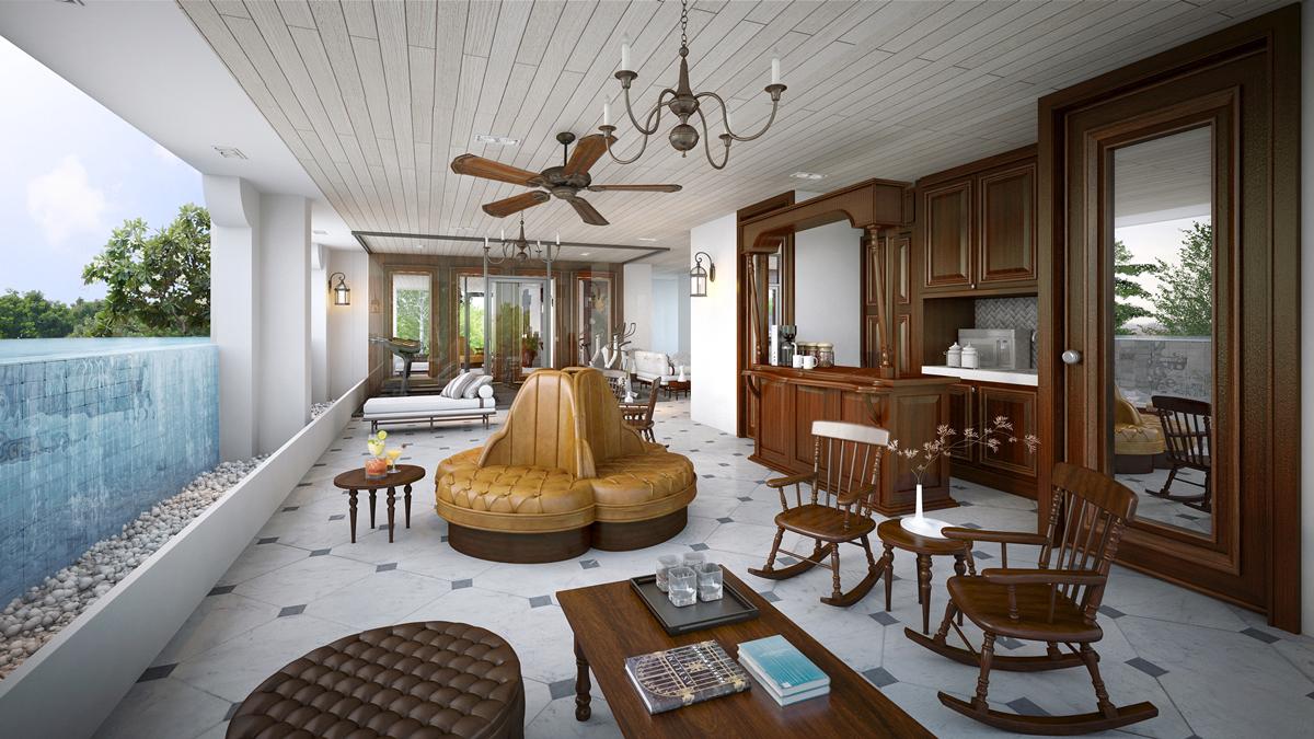 ส่วนราวกันตกห้องจริงจะเป็น Balustrade ซึ่งเป็นดีไซน์แบบวินเทจ ส่วนด้านนอกเป็นเหล็กร็อท ไอร์ออน