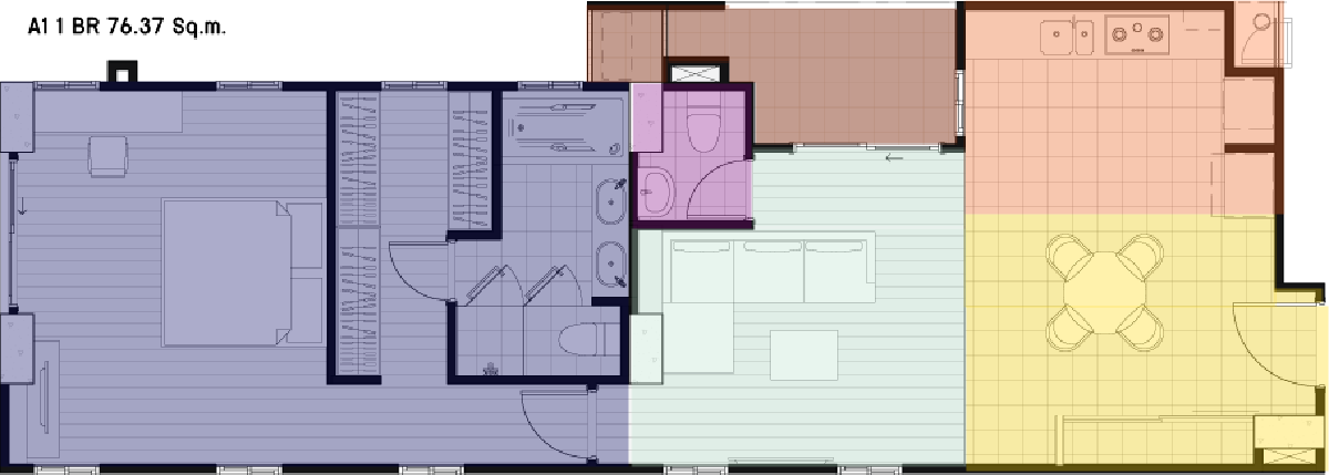 ห้องตัวอย่างแบบ 1 Bedroom ขนาด 76.37 ตารางเมตร เป็นห้องมุมที่มองเห็นวิวทางทิศใต้ (ด้านกว้าง) ทิศตะวันตก และทิศตะวันออก ถือเป็นห้องที่ออกแบบแผนผังมาให้เหมาะสำหรับการอยู่อาศัยคล้ายกับการวางฟังก์ชันของบ้าน โดยแบ่งพื้นที่ออกเป็นส่วนทำกิจกรรม (ครัว ห้องนั่งเล่นและระเบียง) และส่วนพักผ่อน (ห้องนอน) แยกออกจากกันชัดเจน ทำให้ห้องมีความเป็นส่วนตัวสูง ซึ่งไม่ค่อยมีคอนโดมิเนียมเจ้าไหนทำห้องออกมาในลักษณะนี้