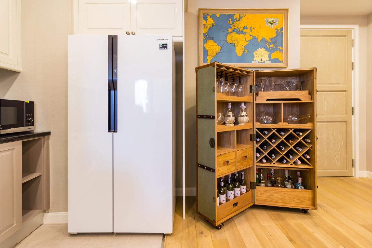 มากันที่ครัวกันต่อ ทางโครงการให้ Fix พื้นที่วางตู้เย็นมาให้ สามารถวางตู้เย็นขนาดใหญ่ได้เลย เเต่ตู้เย็นจะเกินมุมสำหรับวางมานิดหน่อย ไม่ค่อยเป็นสัดส่วนเท่าไร ส่วนด้านข้างจะเหลือเป็นพื้นที่โล่ง อาจจะจัดหาตู้ Built-in มาเพิ่มพื้นที่สำหรับเก็บของด้านข้างก็ได้ จะสังเกตเห็นว่าพื้นของห้องครัวจะเปลี่ยนเป็น Homogeneous Tile แทนพื้นไม้ Engineering wood ซึ่งใช้เป็นพื้นห้องนั่งเล่นยาวไปจนถึงห้องนอน