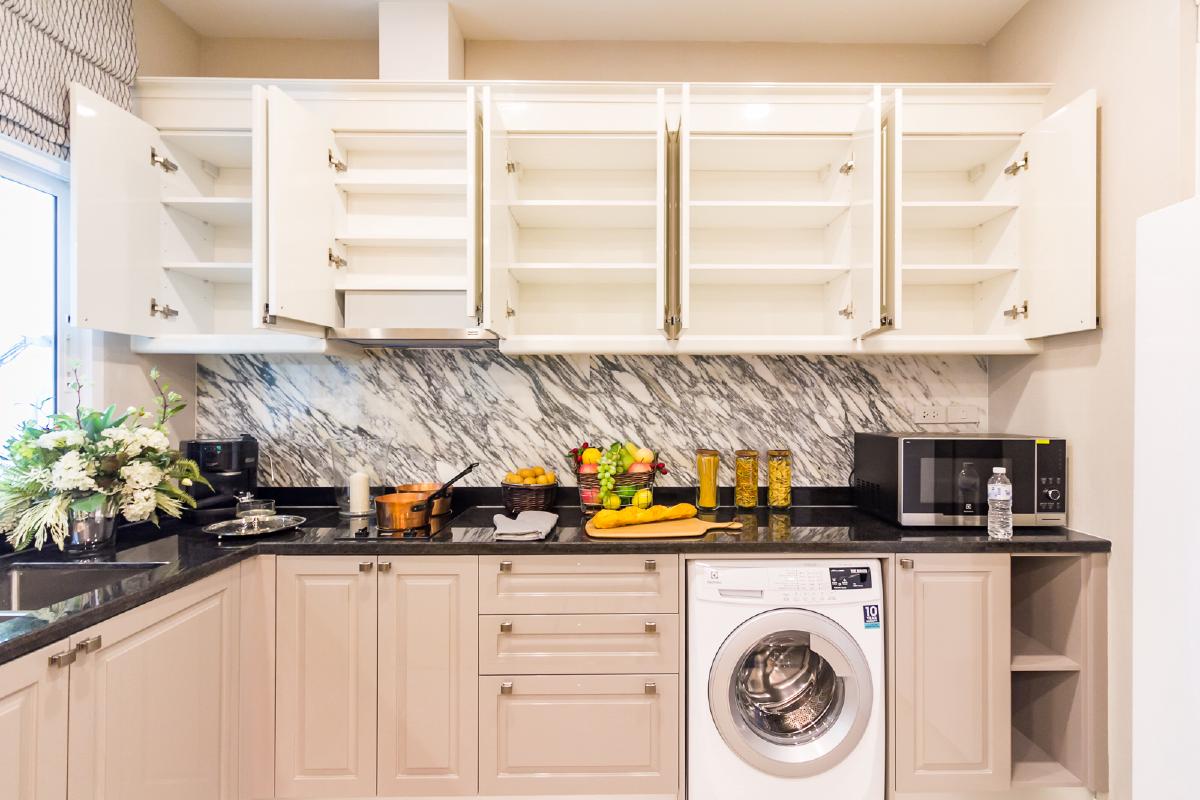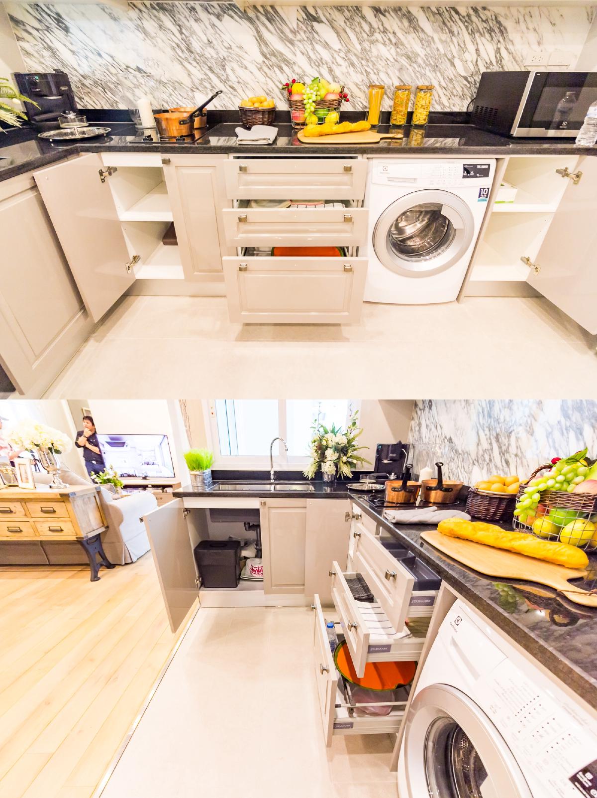 เคาน์เตอร์ครัววางตัวเป็นรูปตัว L ตัวเคาน์เตอร์ชิ้นล่างมีลิ้นชักและตู้แบบ Soft-close สำหรับเก็บอุปกรณ์ต่างๆ แยกไว้ให้เป็นสัดส่วน ท็อปของเคาน์เตอร์ครัวจะเป็นแกรนิตมี มีคุณสมบัติเช็ดทำความสะอาดสะดวก ให้ความเงางามเป็นประกาย ทนกรด ทนด่าง และทนรอยขีดข่วน