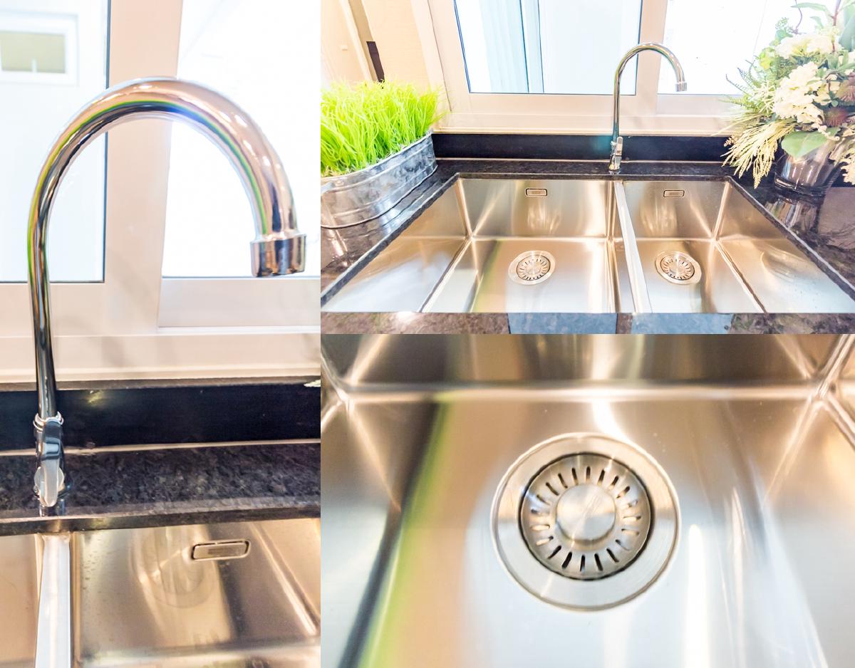 อ่างล้างจานเป็นแบบหลุ่มคู่ของ Franke แยกหลุมสำหรับล้างแก้วออกต่างหาก พร้อมก๊อกน้ำที่หันเปลี่ยนทิศทาง เพื่อให้สะดวกต่อการใช้งานมากยิ่งขึ้น