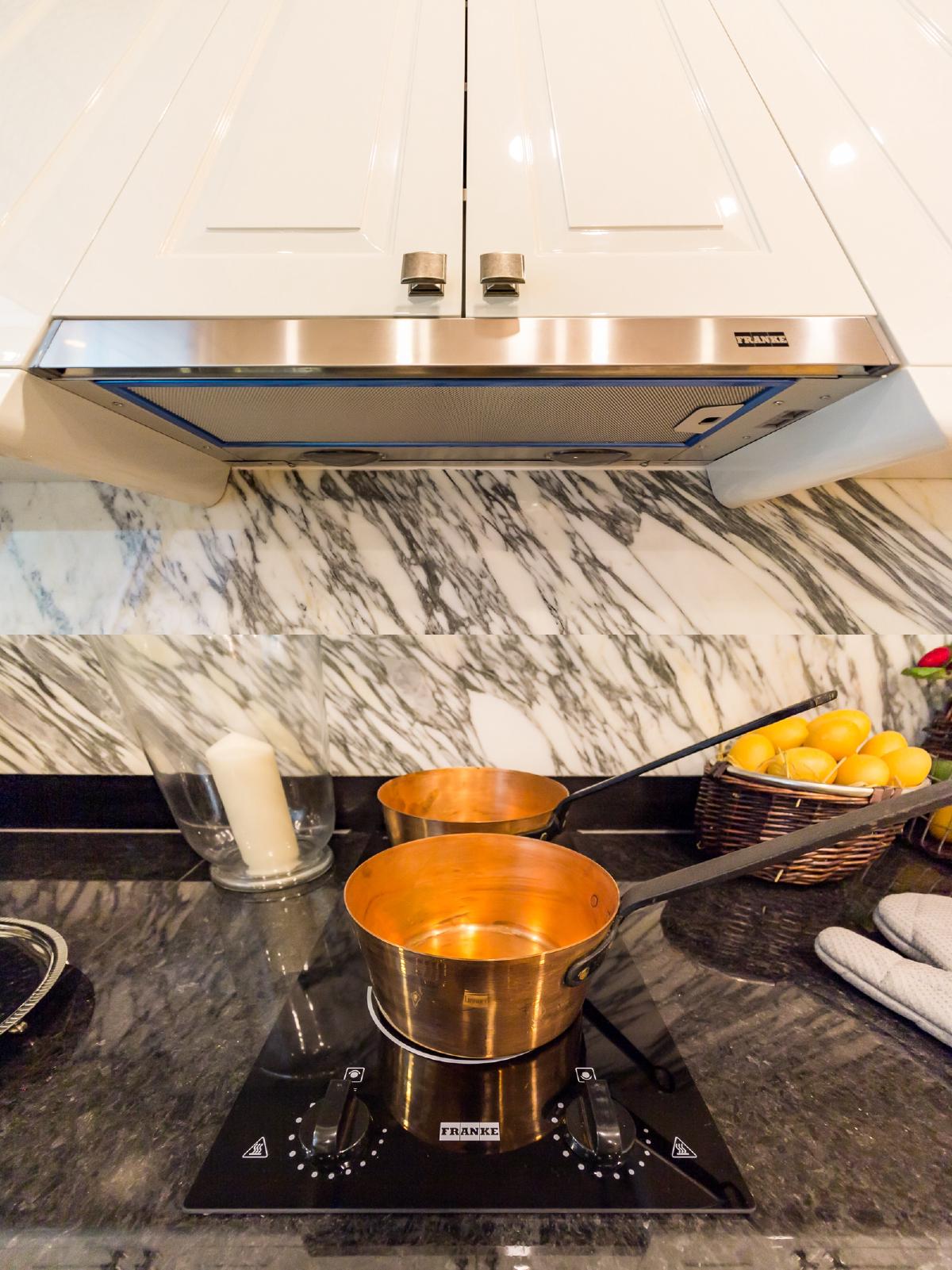 ส่วนเตาไฟฟ้า 2 หัวเป็นของ Franke ให้มาพร้อมกับเครื่องดูดควันแบบปล่อยออกนอกอาคาร พื้นผนังด้านหนังกรุกระเบื้องลายหินอ่อน เพื่อป้องกันคราบน้ำมันจาการประกอบอาหารและสามารถเช็ดล้างทำความสะอาดได้ง่ายขึ้น