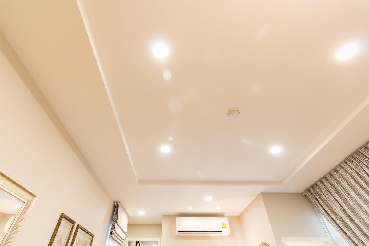 เงยหน้ามองฝ้าด้านบนมีการเล่นระดับฝ้าให้ดูสวยงามเข้ากับไตล์วินเทจ ไฟภายในห้องจะเป็นไฟ Down light และมีเครื่องตรวจจับควันไฟติดมาให้เรียบร้อย