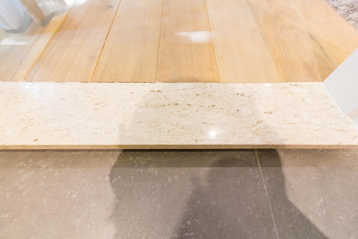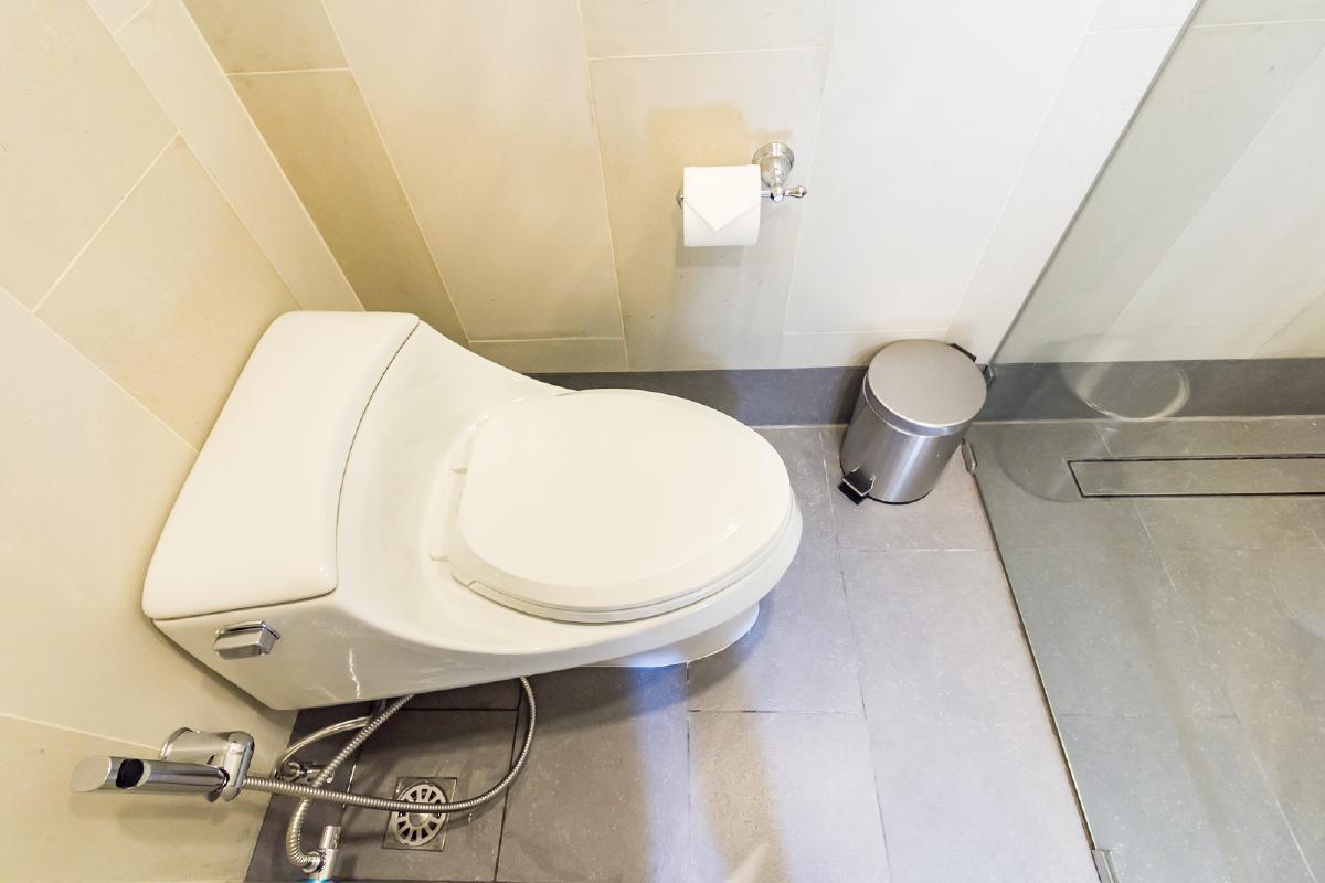 พื้นห้องน้ำจะลดระดับลงมาจากพื้นด้านนอก เพื่อป้องกันน้ำไหลย้อนออกไป ส่วนพื้นห้องน้ำจะปูด้วย Homogeneous Tile สีเทากันลื่นได้ดี