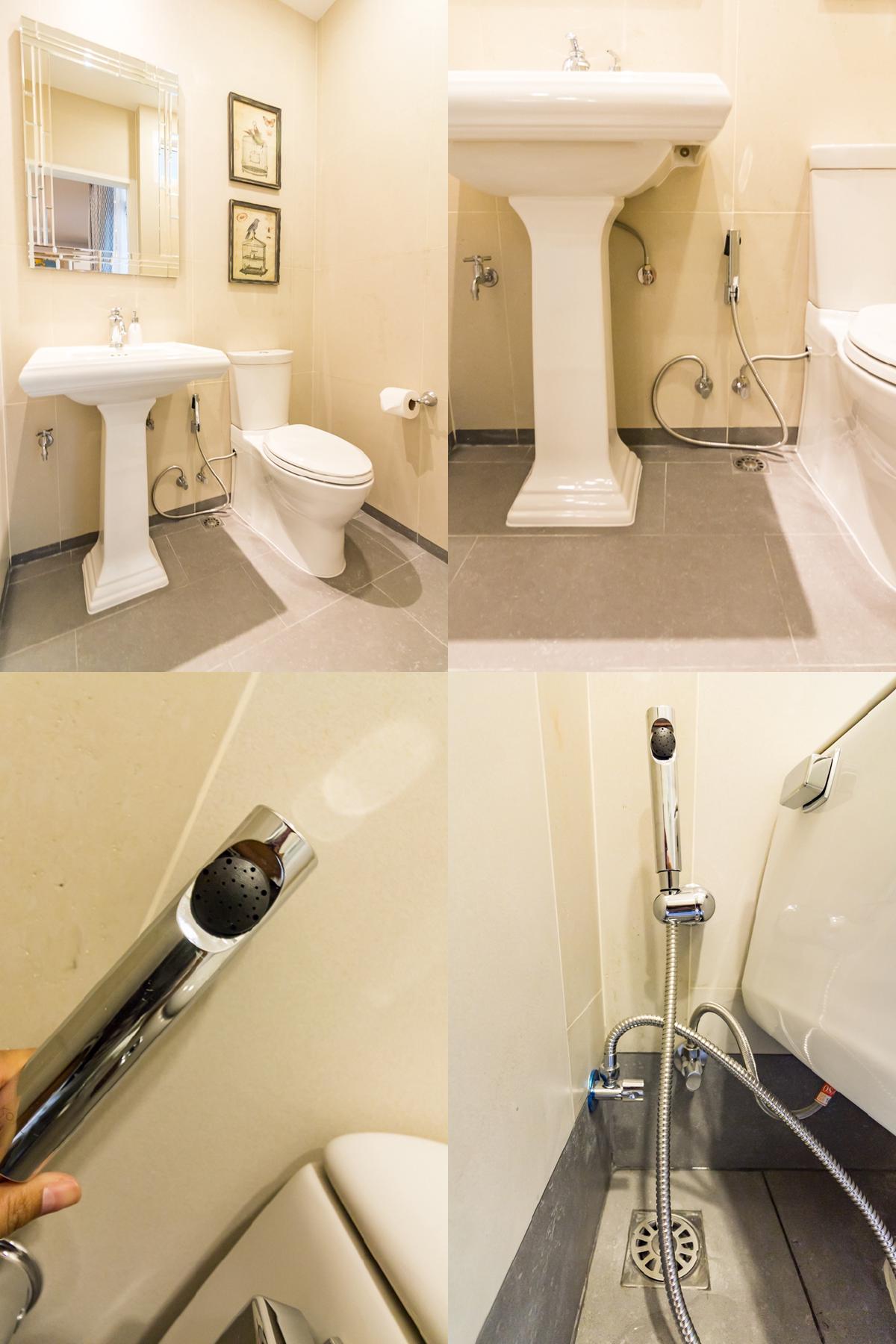 ช่องทางเข้าฝั่งโถสุขภัณฑ์มีราวให้แขวนฉากกั้นเพิ่ม เพื่อสร้างความเป็นส่วนตัว มองเหนือขึ้นไปอีกจะเป็นช่องระบายอากาศ ส่วนไฟในห้องจะเป็นไฟดาวน์ไลท์ ให้แสงสว่างพอประมาณ