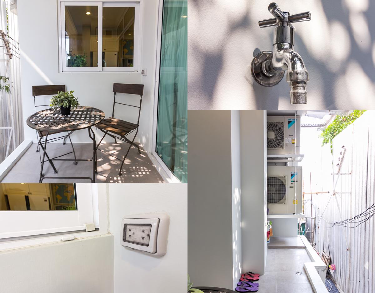 ด้านนอกระเบียงมีขนาดค่อนข้างกว้าง สามารถจัดเป็นมุมกินลม ชมวิวได้ด้วยการหาชุดเก้าอี้สนามมาตั้ง ด้านข้างจัดปลั๊กไฟไว้ให้ใช้งานด้วยอีกจุด ส่วนคอมเพรสเซอร์แอร์จะทำหลบมุมอยู่อีกฝั่ง ทำให้ระเบียงนั่งเล่นไม่โดนลมร้อนจากคอมเพรสเซอร์แอร์โดยตรง