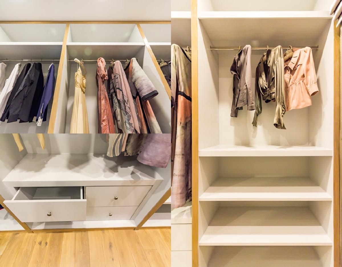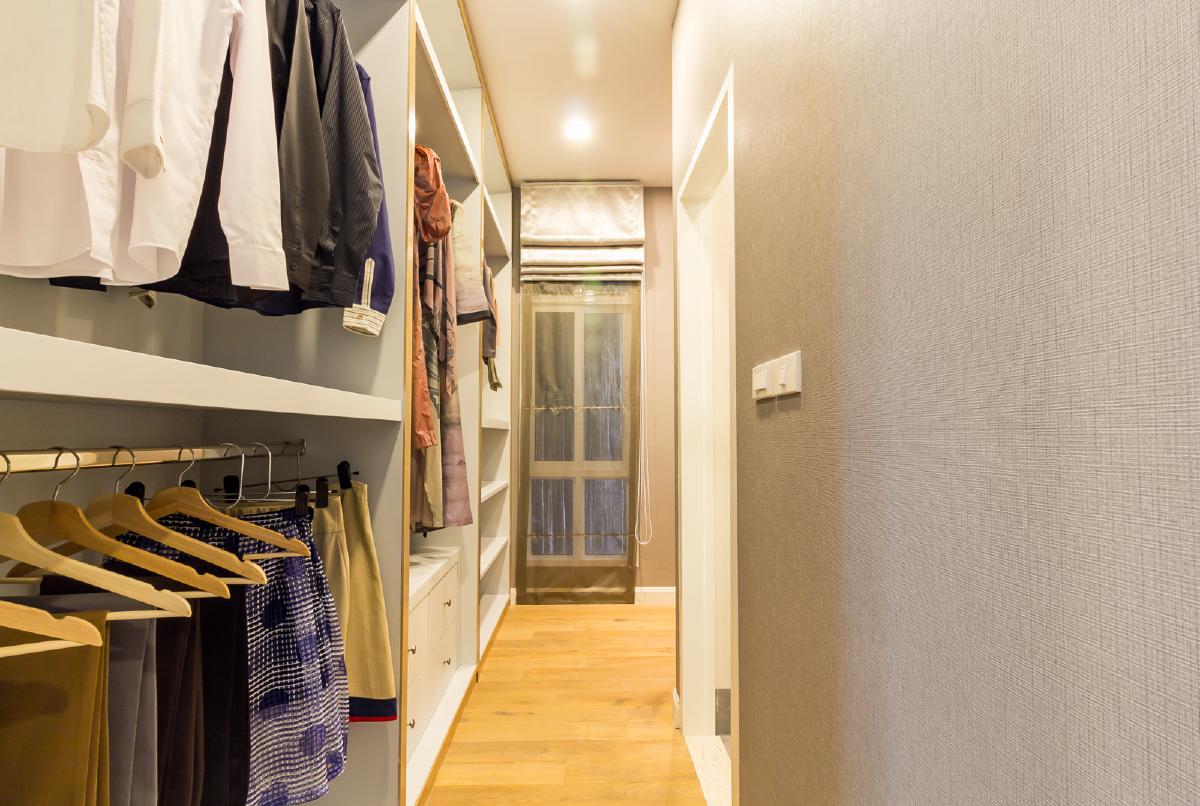 Walk-in closet สร้างแยกออกมาเป็นสัดส่วน ตู้เสื้อจะได้แบบ Built-in หน้าบานเปิดโล่ง มุมห้องจะเป็นหน้าต่าง ตรงนี้อาจจะหาม่านมาใช้บังสายตาเพิ่มเติมเวลาแต่งตัว ส่วนขวามือจะเป็นประตูทางเข้าห้องน้ำ