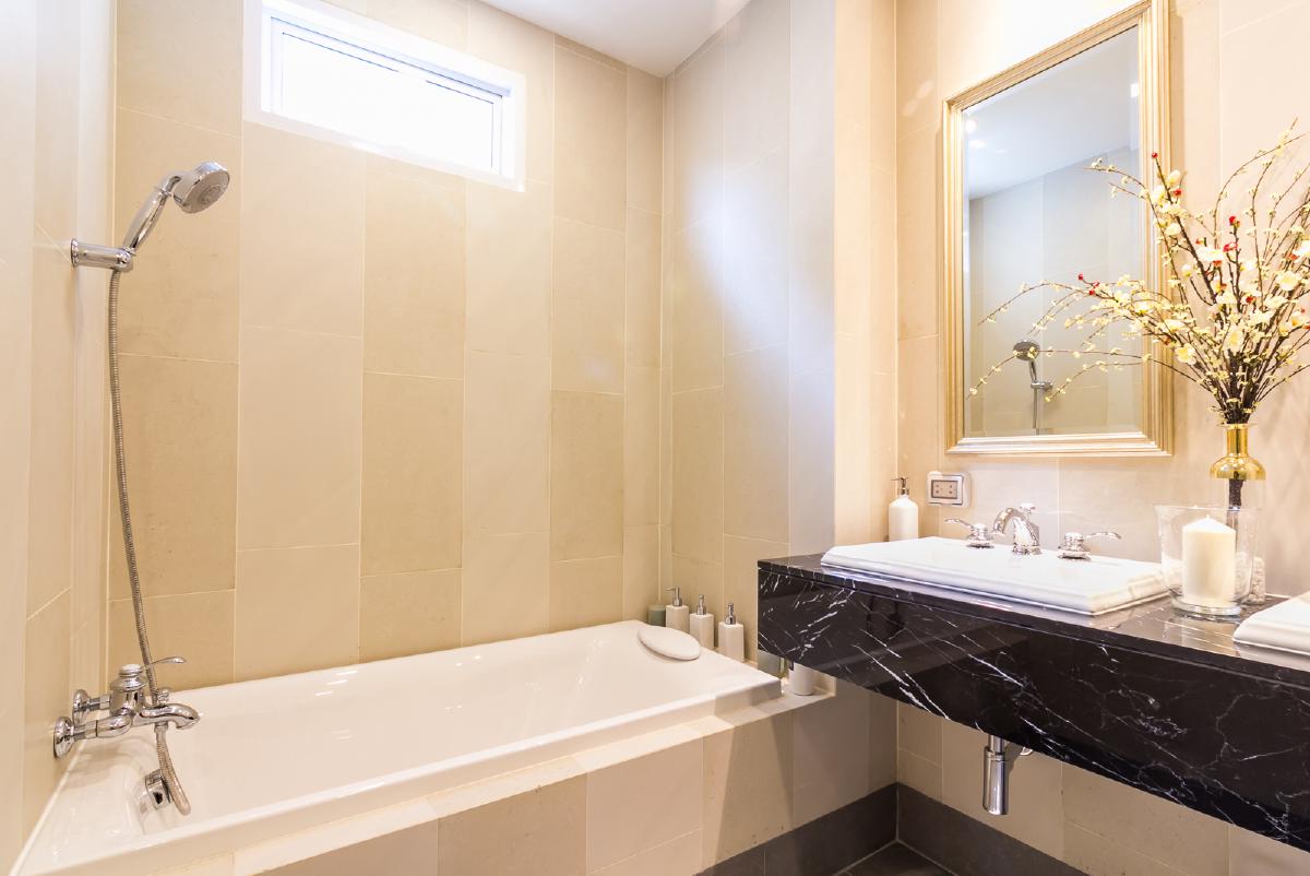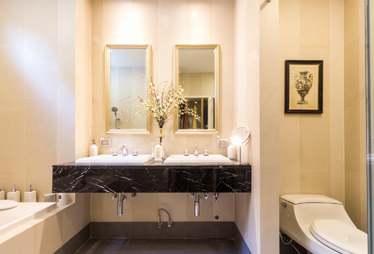 ห้องน้ำใหญ่จะค่อนข้างกว้าง แยกส่วนเปียกและส่วนแห้งออกจากกันชัดเจน และจุดเด่นของที่นี่คือได้ อ่างล้างหน้าแบบ His&Her ของ kohler ประเภทแขวนผนัง ท็อปเป็นลายหินอ่อนดูสวยงาม ใช้เป็นพื้นที่วางของเพิ่มเติมได้เลย