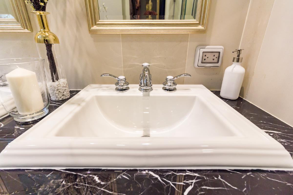 สุขภัณฑ์ภายในห้องน้ำ Verde Sukhumvit 49/15 คัดสรรมาให้เข้ากับสไตล์การตกแต่งแบบวินเทจ อย่างการเลือกอ่างล้างหน้าแบบขาตั้งพื้นที่มีรูปทรงดูวินเทจเข้ากับคอนเซปต์ของโครงการ โดยสุขภัณฑ์ทั้งหมดจะเป็นของ Kohler ด้านข้างอ่างล้างหน้าจะเป็นชักโครก พร้อมสายฉีดชำระ และที่ใส่กระดาษทิชชู่ หัววาล์วน้ำของโถสุขภัณฑ์และสายฉีด ทำมาแบบแยกออกจากกัน ซึ่งง่ายต่อการซ่อมแซมดี
