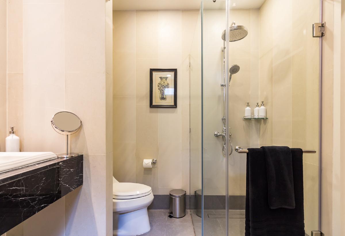 หันมาอีกฝั่งเป็นที่ตั้งของโซนเปียกกั้นด้วย shower box มาให้ เพื่อป้องกั้นน้ำกระเด็นออกมาด้านนอก ส่วนข้างๆ จะเป็นที่ตั้งโถสุขภัณฑ์ ตั้งเหลื่อมหลังผนังเพื่อใช้ผนังบังสายตาได้อีกทาง
