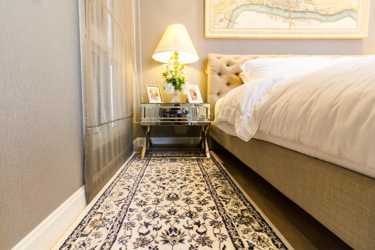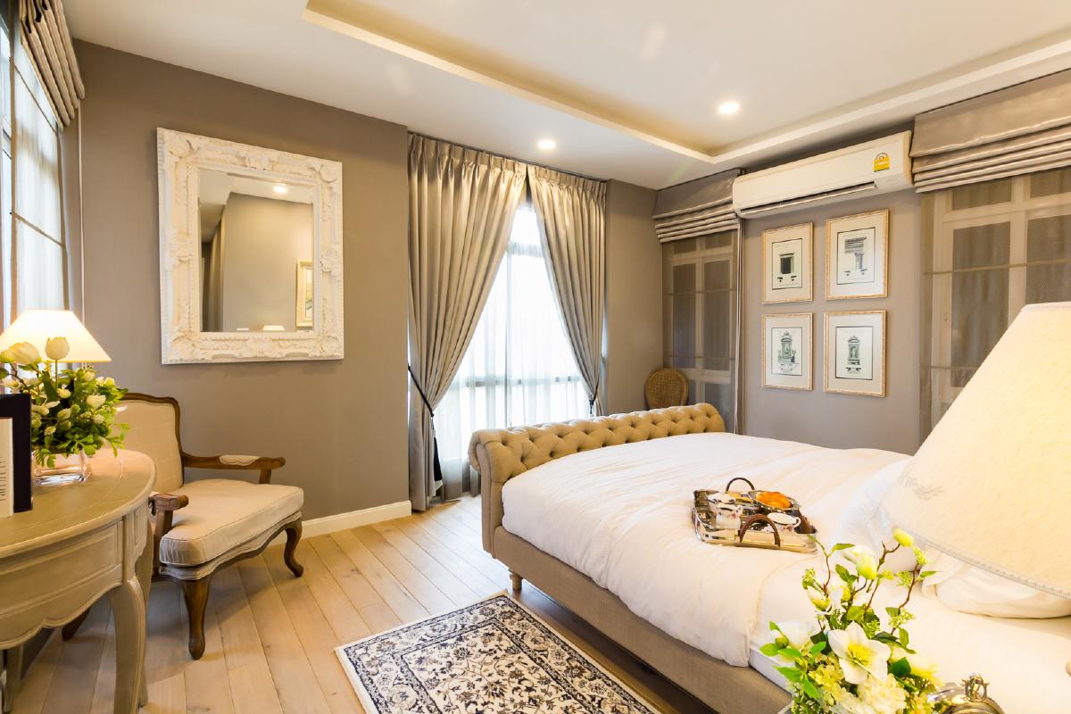 สำหรับห้องนอนในห้องจริงจะได้มาเป็นห้องเปล่า แต่ติดวอลเปเปอร์มาให้เรียบร้อยเหมือนส่วนอื่นๆ พื้นห้องปูด้วย Engineering wood ทำให้ห้องดูอบอุ่น เหมาะกับการตกแต่งในสไตล์วินเทจ ส่วนขนาดเตียงสามารถวางได้ถึงขนาดคิงไซส์ไม่ได้ติดขัดด้านพื้นที่ เหลือทางให้เดินรอบเตียงได้สบายๆ