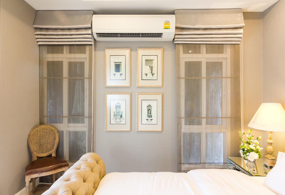 ห้องนอนติดตั้งแอร์เพิ่มให้ 1 ตัวของ Daikin ปลายเตียงมีหน้าต่างบานคู่เปิดโล่งออกไปเห็นวิวทางทิศใต้