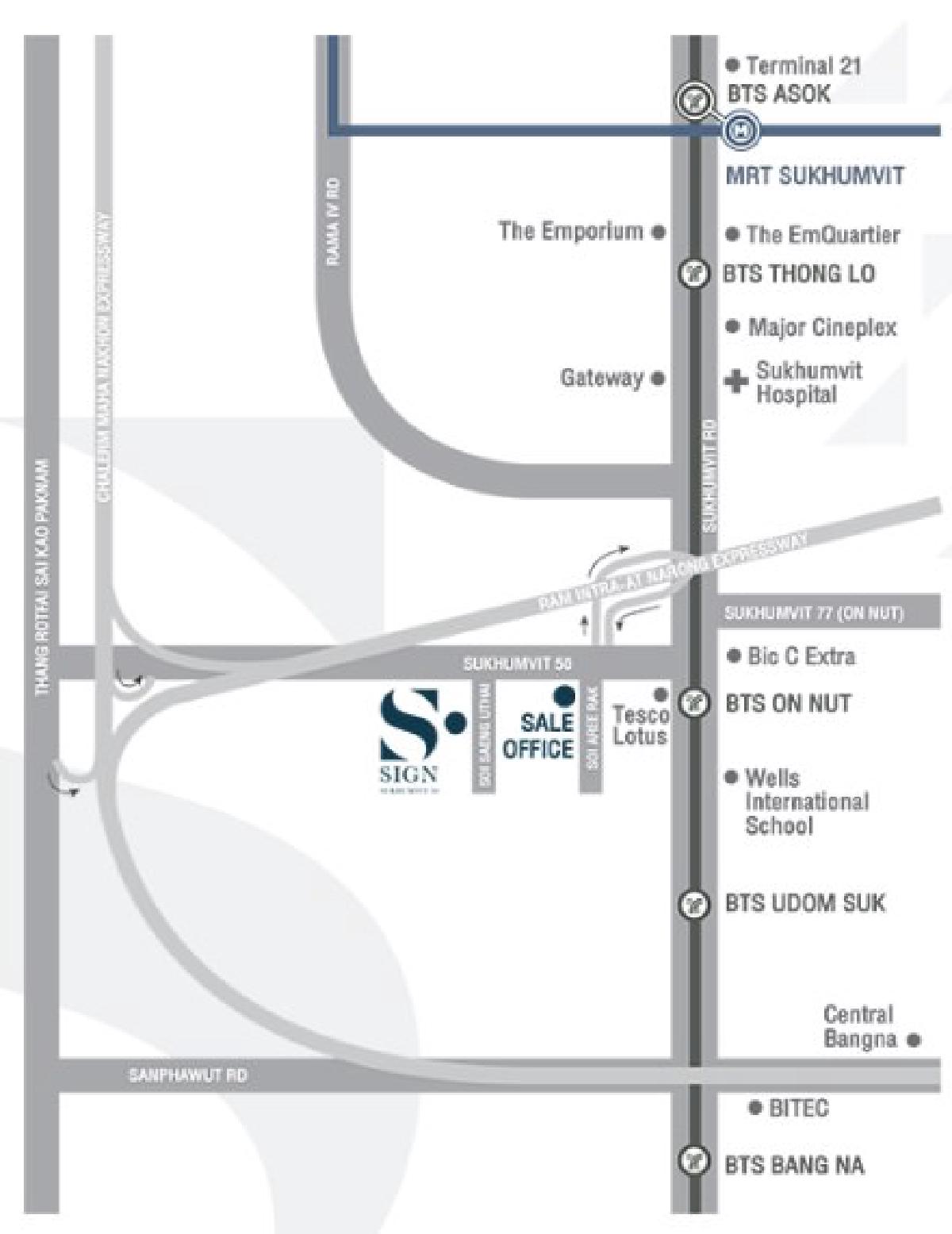 แผนที่โครงการ SIGN Condo Sukhumvit50 (ซายน์ คอนโด สุขุมวิท 50) โดยตัวสำนักงานขายจะอยู่ก่อนถึงที่ดินโครงการจริง หากเข้าจากปากซอยสุขุมวิท 50 ก็จะเลยโลตัสอ่อนนุชไปนิดเดียว อยู่ใกล้แนวรถไฟฟ้า BTS สายสีเขียวสถานีอ่อนนุชเพียง 800 เมตร และยังใกล้กับจุดขึ้นลงทางด่วนรามอินทรา-อาจณรงค์ ทะลุกับถนนทางรถไฟสายเก่าปากน้ำ และขึ้นทางพิเศษเฉลิมมหานครได้อีกด้วย