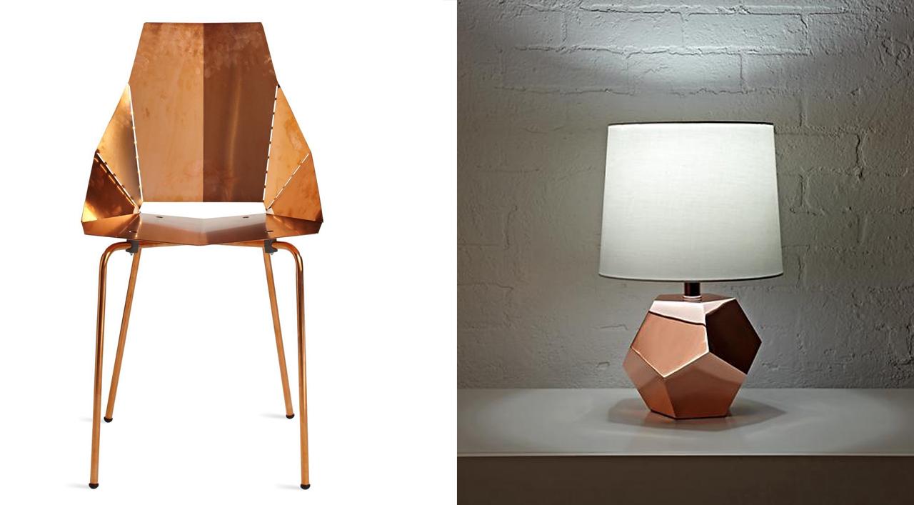 Panel : อีกรูปแบบหนึ่งจะเป็นทองแดงทั้งแผ่น ซึ่งจะสะท้อนแสงและเงาได้ดี แต่ยังไม่หลุดจากความเป็น geometry จะเห็นได้ชัดเจนจากเหลี่ยมมุม และไม่ค่อยมีลวดลายอะไรมากนัก ความบางของโครงสร้างทำให้เฟอร์นิเจอร์ดูเพรียวและคงความทันสมัยเอาไว้ ซึ่งการนำไปตกแต่งคอนโดให้ร่วมสมัยจึงไม่ใช่เรื่องยากนัก