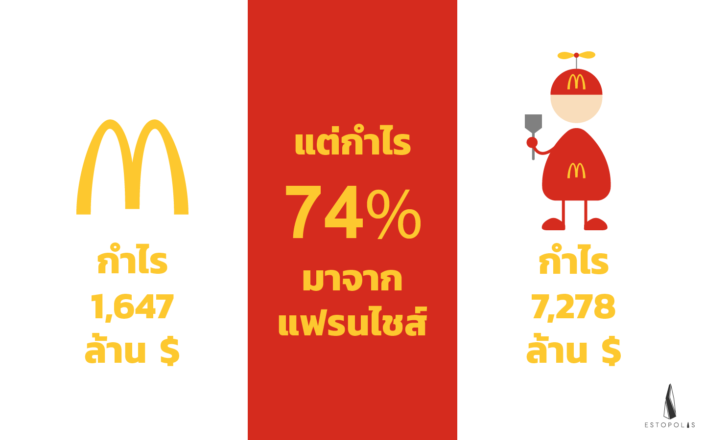 ใช่ครับ แค่ลองมาดูกำไรของแต่ละส่วนดีกว่าครับ ลองสังเกตุที่แผนภาพจะเห็นว่ากำไรจากสาขาที่ดำเนินการด้วยตกเองนั้นที่ค่าใช้จ่ายตั้ง 13,977 ล้านดอลล่าร์เลยทีเดียว ในขณะที่ กำไรจากสาขาของแฟรนไชส์มีค่าใช้จ่ายเพียง 1,647 ล้านดอลล่าร์เท่านั้นส่วนที่เหลือก็ เงินเข้ากระเป๋าสบายๆ 7,278 ล้านดอลล่าร์กันเลยนะครับ ถ้าเทียบเป็นเปอร์เซ็นก็ประมาณ 74% เลยทีเดียวครับ ได้กันเท่านี้ก็นอนนับเงินสบายๆเลยนะครับผม