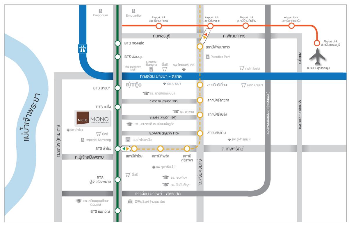 NICHE MONO สุขุมวิท-แบริ่ง คำนึงถึงความสะดวกสบายด้านด้านการเดินทางเป็นหลัก จึงเลือกทำเลติดรถไฟฟ้า BTS สายสีเขียว ซึ่งถือเป็นเส้นทางรถไฟฟ้าสายหลักของกรุงเทพฯ ในการเข้าสู่ใจกลางเมืองอย่าง อโศก ทองหล่อ สีลม เป็นต้น และในอนาคตยังจะเชื่อมต่อออกนอกเมืองไปสู่จังหวัดสมุทรปราการได้อีกด้วย