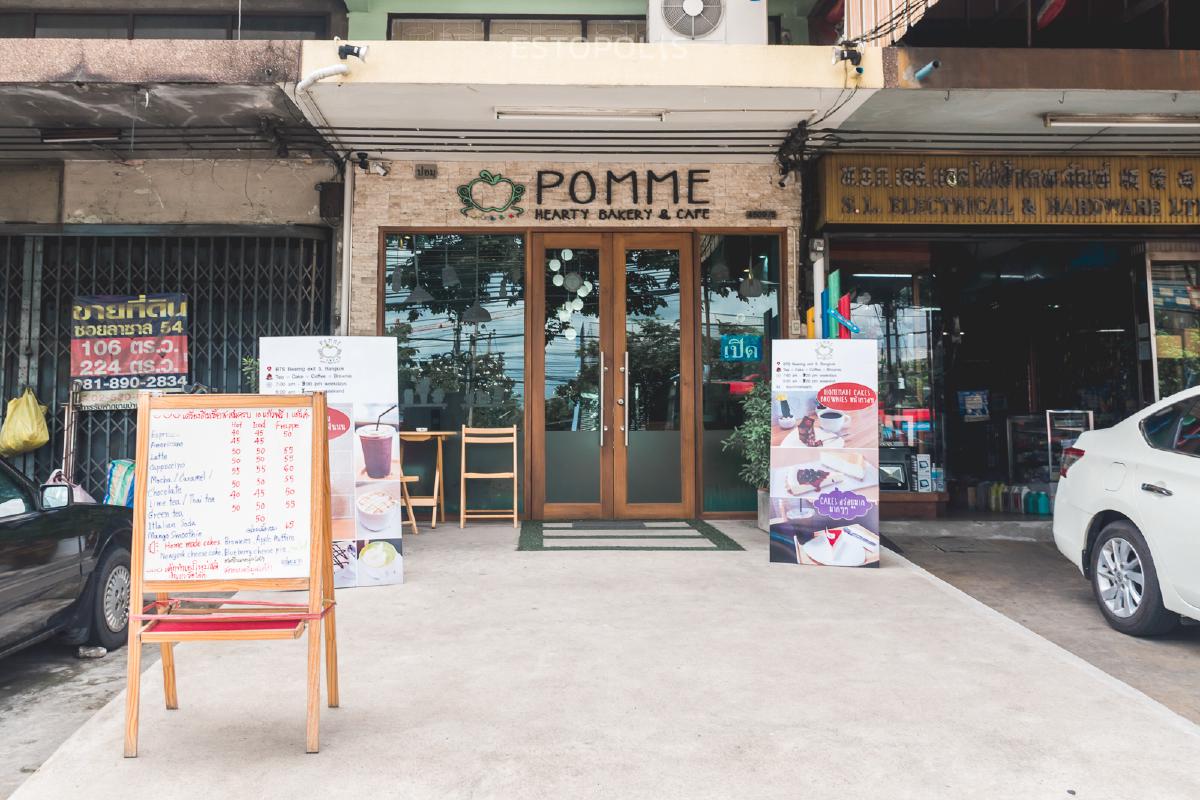 ชื่อเต็มของร้าน คือ POMME HEARTY BEKERY & CAFE เป็นคาเฟ่แนว Loft ดูอบอุ่นด้วยงานไม้ และมีบรรยากาศเรียบง่ายแบบเป็นกันเอง เครื่องดื่มภายในร้านก็มีให้เลือกทั้งแบบร้อนและแบบเย็น ส่วนของว่างจะเป็นขนมหวานจำพวกเค้กและมัฟฟินในราคาเบาๆ