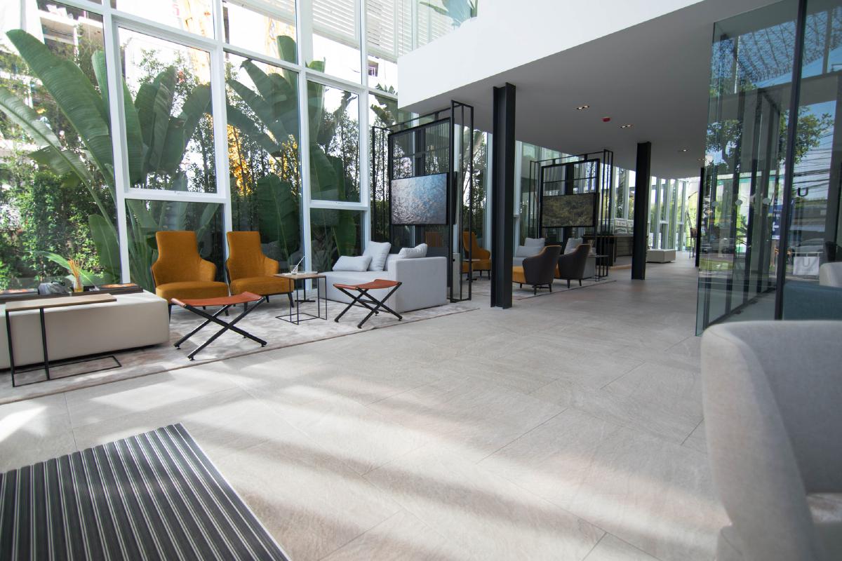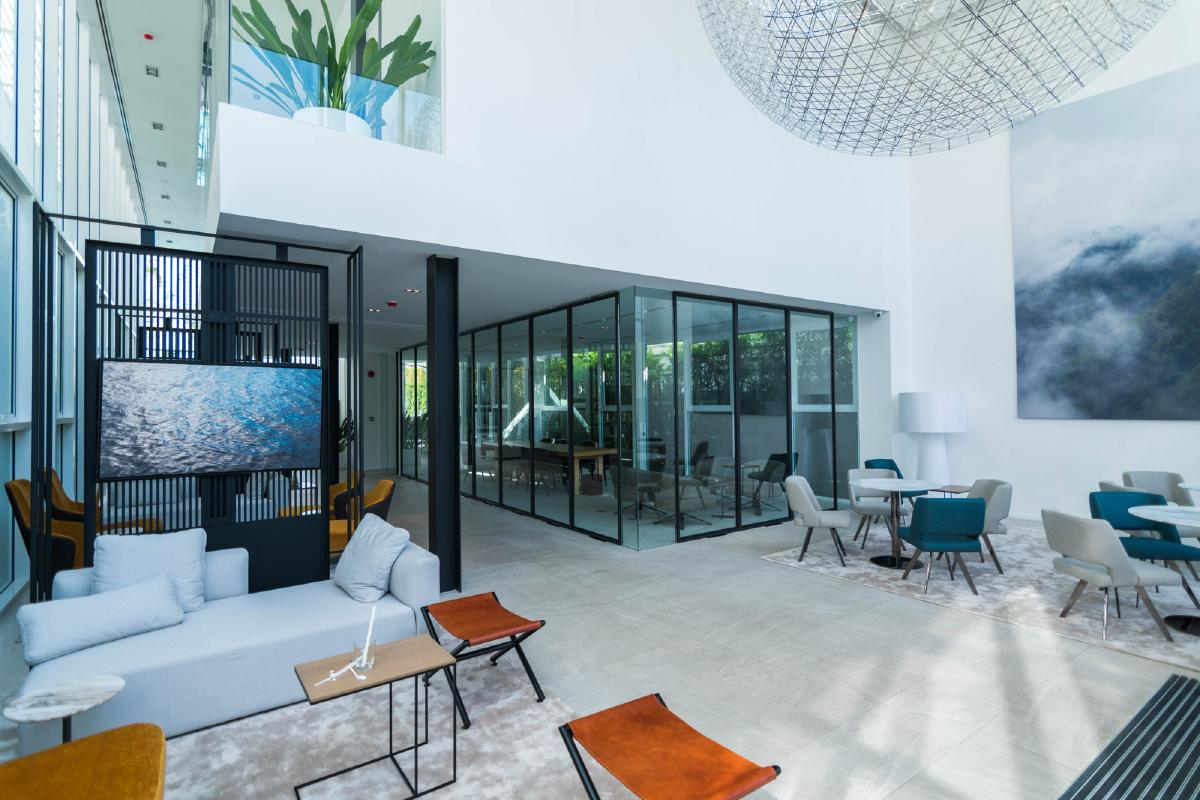 เมื่อเปิดประตู Clubhouse เข้าไป จะเป็นโถงรับรองสำหรับผู้ที่สนใจเข้าชมโครงการ คอนโด ยู เกษตร-นวมินทร์ (Condo U Kaset-Nawamin) ฝั่งขวามือของภาพเป็น Co-working Space ของ Clubhouse