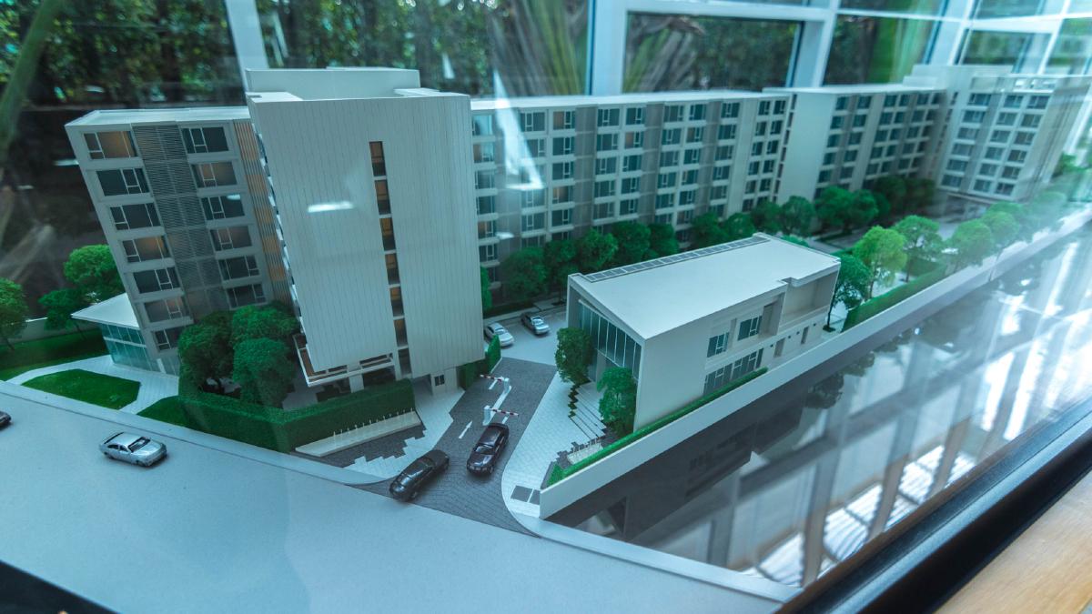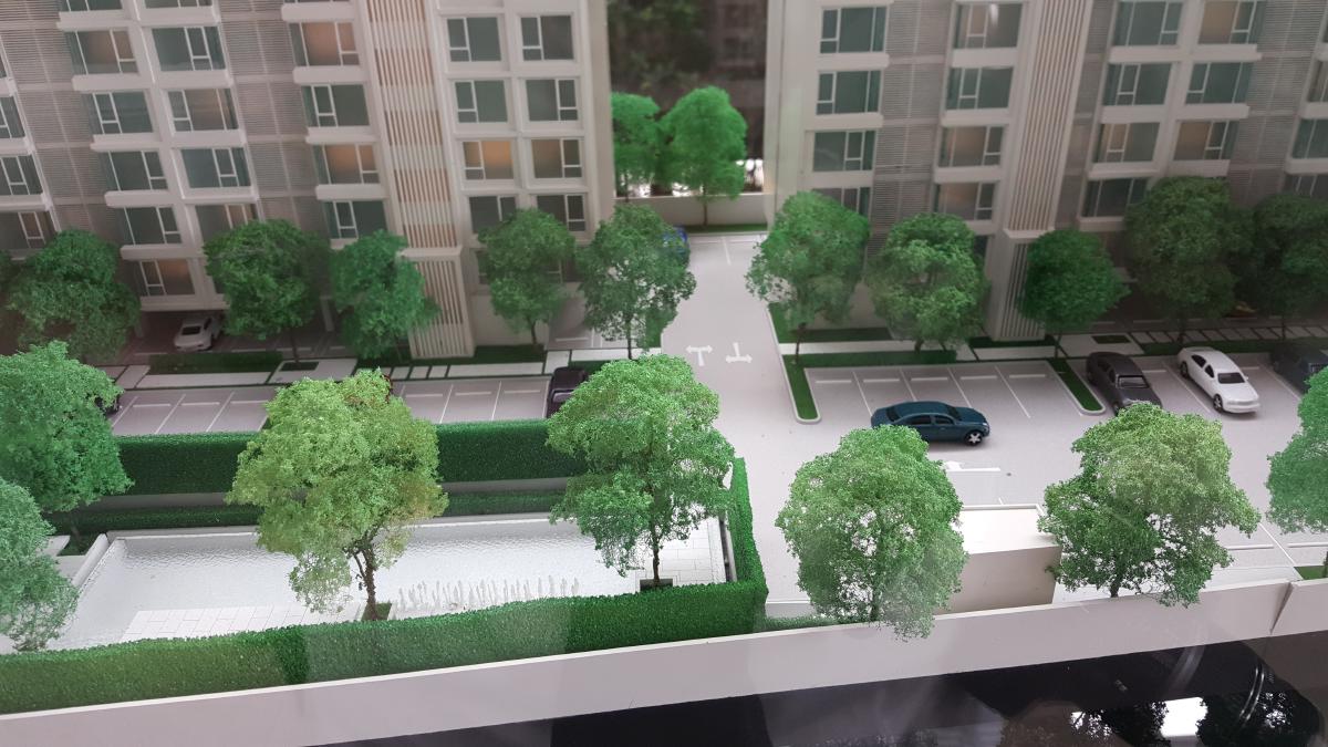 โมเดลโครงการได้จำลองสภาพแวดล้อมให้ได้เห็นอย่างชัดเจน เช่น ลานจอดรถ สวนหย่อม ต้นไม้ และรูปแบบตัวอาคารทั้ง 2 อาคาร