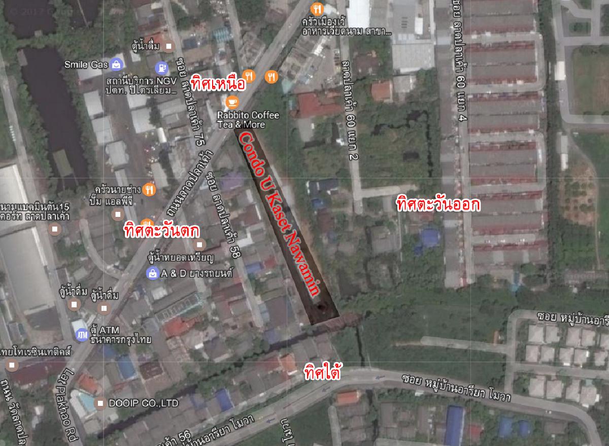 ที่ตั้งโครงการ Condo U Kaset Nawamin จากรูปจะเห็นว่าเนื้อที่ของโครงการเป็นลักษณะยาวและลึกเข้าไปทำให้ส่วนใหญ่อาคารของโครงการจะหันรับทางทิศตะวันออกและทิศตะวันตก ส่วนด้านหน้าโครงการที่เป็นทิศหนือจะมีเพียงห้องริมของอาคาร A และอาคาร Clubhouse เท่านั้น สำหรับบริเวณรอบตัวโครงการ Condo U Kaset-Nawamin มีอาณาเขตติดกับอะไรบ้างนั้นมาดูแต่ละทิศดังนี้