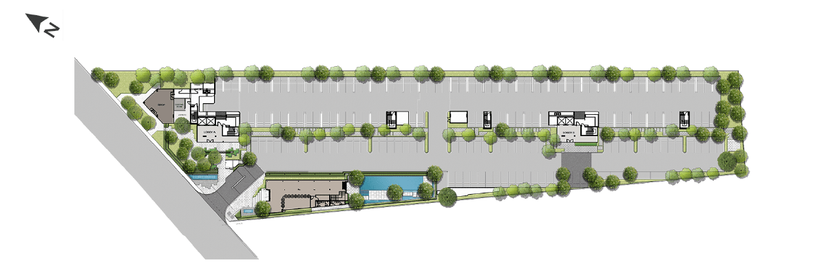 จากผังอาคาร C (Clubhouse) จะอยู่ตรงบริเวณทางเข้าโครงการ เป็นอาคารลักษณะโปร่งสูง 2 ชั้น ด้านในเป็น Lobby, Co-working Space เชื่อมออกไปยังสระว่ายน้ำด้านนอก ชั้นสองเป็นฟิตเนส อาคาร ส่วนอาคารA และอาคาร B เป็นที่พักอาศัย อาคารละ 222 ยูนิต