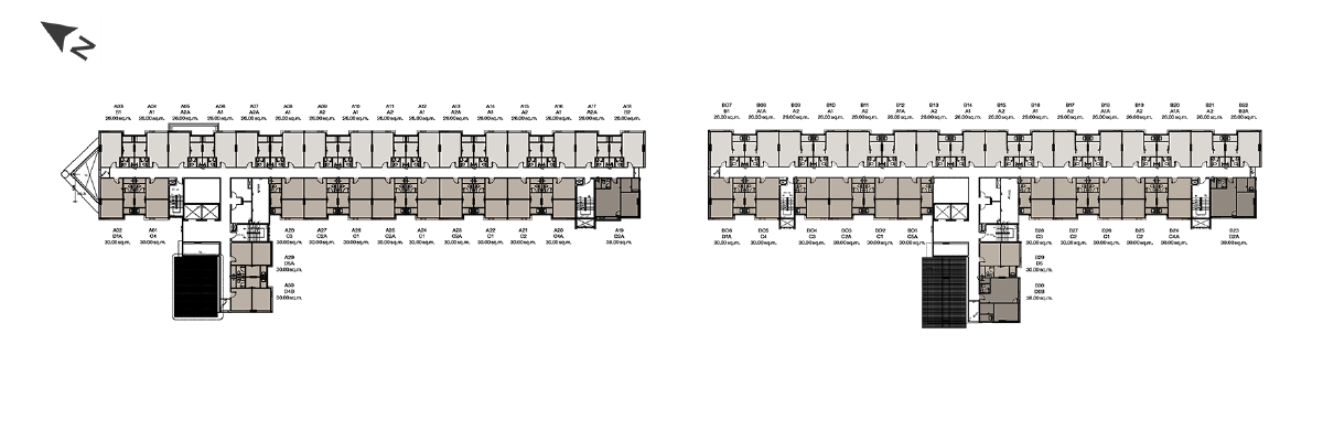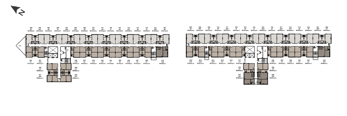 ชั้น 2 เป็นชั้นพักอาศัย อาคาร Aและ B มีห้องยื่นออกมาอาคารละ 1 ห้อง โดยอาคาร A อยู่ตรงฝั่งซ้ายมือของตึก อาคาร B ยื่นออกมาตรงกลางตึก ขนาดของห้อง สีเทาอ่อนด้านนอกเป็นห้องขนาด 26 ตร.ม. สีเทาเข้มด้านในเป็นห้องขนาด 30 ตร.ม. และสีเทาเข้มที่สุด มุมขวามือของอาคาร A,B และห้องที่ยื่นออกมาริมสุดของอาคาร B ในรูป เป็นห้องขนาด 38 ตร.ม.