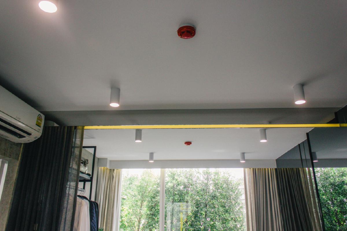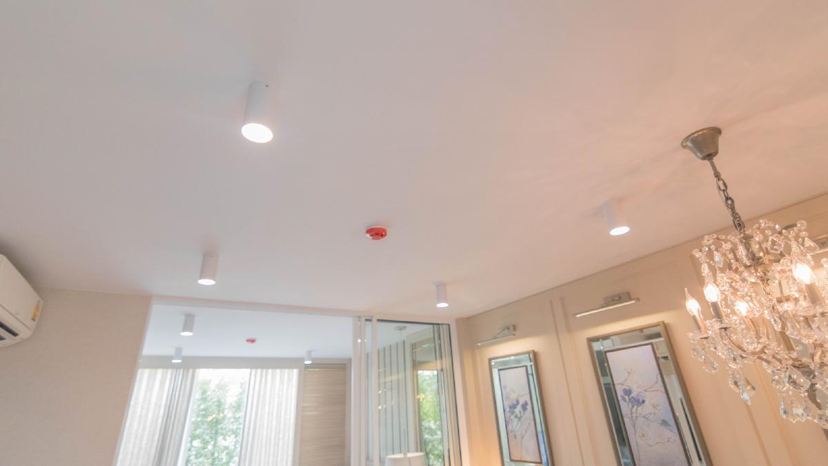 ห้องนั่งเล่นและห้องนอนมีไฟดาวน์ไลท์ทรงกระบอก ห้องละ 4 ดวงพร้อมกับ smoke detector ห้องละ 1 ตัว เพดานสูง 2.40 เมตร