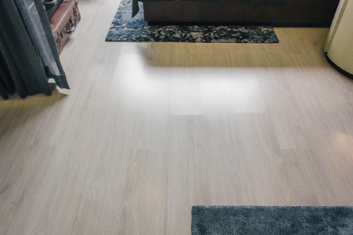 พื้นเป็นพื้นไม้ลามิเนตหนา 8 มม. สีสว่างจึงไม่ทำให้ห้องดูมืด