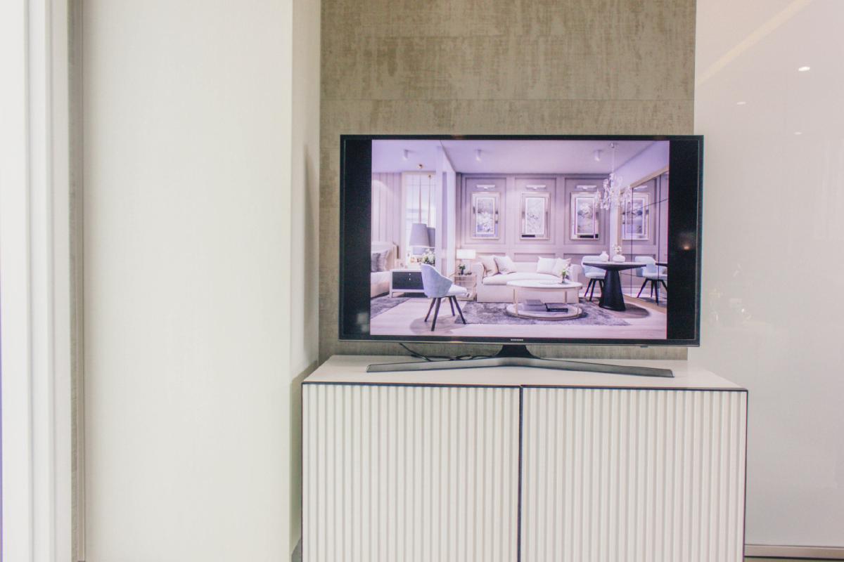 ตู้เก็บรองเท้าเหมือนกันกับห้องแรกมีทั้งหมด 7 ชั้นไม่รวมชั้นล่าง ส่วนชั้นวางทีวีห้องนี้จะเป็นอีกแบบไม่เหมือนกันกับห้องแรก มีช่องเก็บของค่อนข้างเยอะ ประตูเปิดปิดตู้ทั้งตู้เก็บรองเท้าและตู้เก็บของชั้นทีวีเป็นแบบ Soft Close ทั้งหมดเหมือนกันกับประตูตู้ห้องแรก ด้านหลังที่วางทีวีขนาด 49 นิ้ว มีเต้าเสียบปลั๊กไฟและช่องเสียบสัญญาณทีวีให้