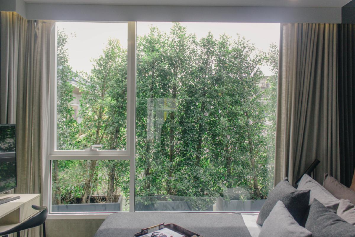ส่วนผนังและหน้าต่างฝั่งห้องนอนเป็นกระจก Laminated Glass เขียวตัดแสง ที่ใช้ในอาคารสูงเมื่อเกิดการกระแทกจะไม่แตกเพียงแค่เป็นรอยร้าวเท่านั้น เพราะกระจกเคลือบหนาถึง 2 ชั้น หน้าต่างของห้องเป็นแบบบานกระทุ้งกว้าง 70 ซม.