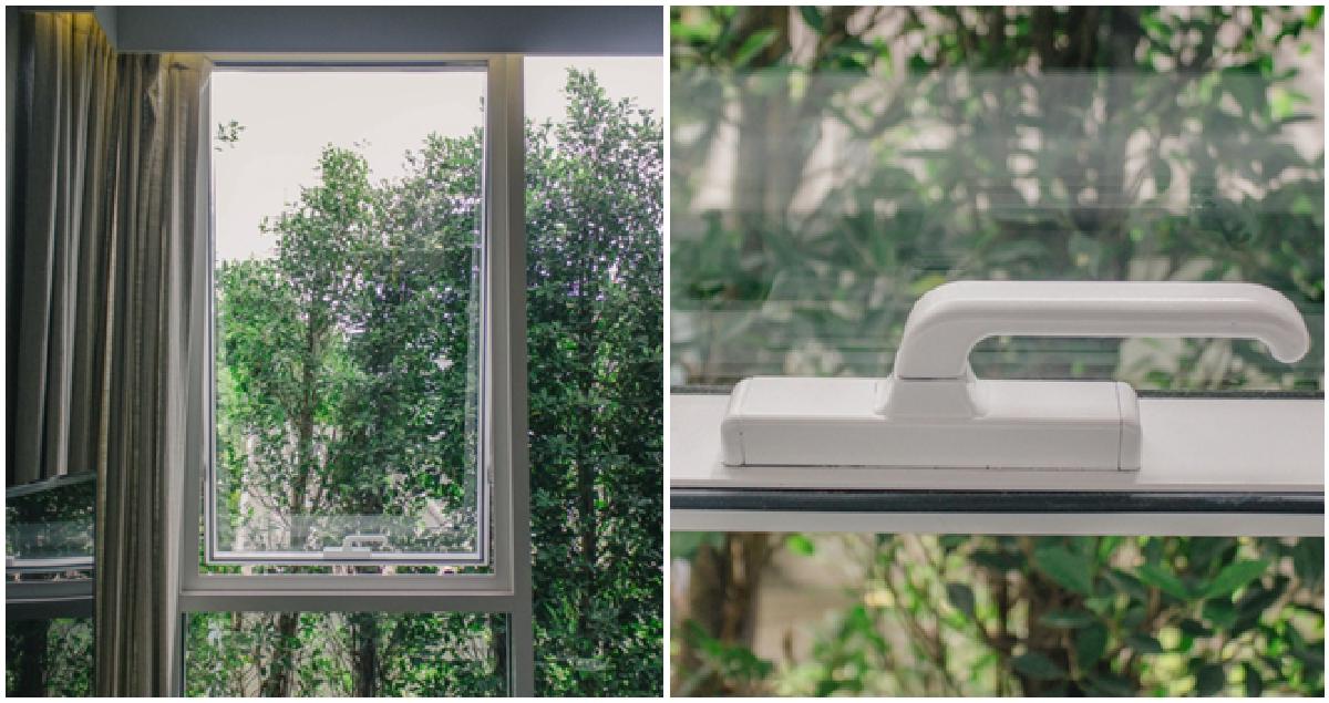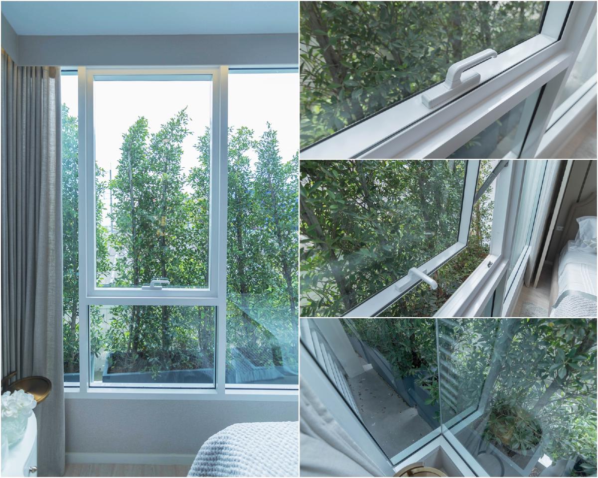 สำหรับกระจกเป็นกระจกนิรภัย Laminated Glass เขียวตัดแสง หน้าต่างเป็นหน้าต่างบานกระทุ้ง กว้าง 70 ซม. อยู่ซ้ายมือ กรอบของหน้าต่างเป็น Aluminium Powder Code สีขาว ความพิเศษของกระจกของโครงการในทุกๆ ห้องจะเป็นกระจกแบบเข้ามุม ซึ่งทำให้ผู้อาศัยสามารถมองเห็นวิวที่กว้างขึ้นจากหน้าต่าง