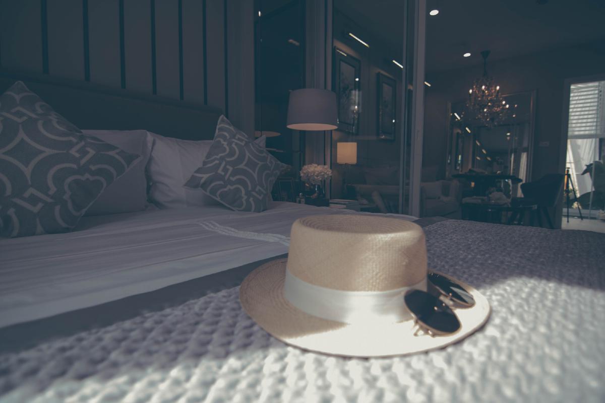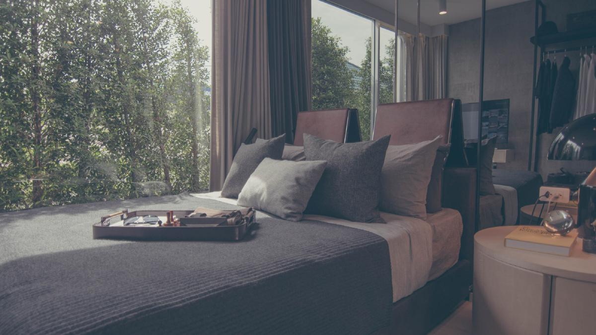 อีกมุมมองหนึ่งของห้องนอนจะเห็นว่าบริเวณหัวเตียงห้องตัวอย่างโครงการ คอนโด ยู เกษตร-นวมินทร์ มีการกรุด้วยกระจกช่วยทำให้ห้องดูโปร่งและกว้างไม่อึดอัดแม้ขนาดห้องจะมีพื้นที่ใช้สอยเพียง 26 ตร.ม.