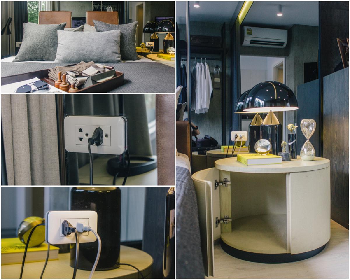 สำหรับสองข้างฝั่งของหัวเตียงมีเต้าเสียบปลั๊กไฟให้ใช้ฝั่งละ 2 ช่องเสียบ ฝั่งขวามือของเตียง (ขวามือจากรูป) โครงการนำชั้นวางโคมไฟมาตกแต่ง