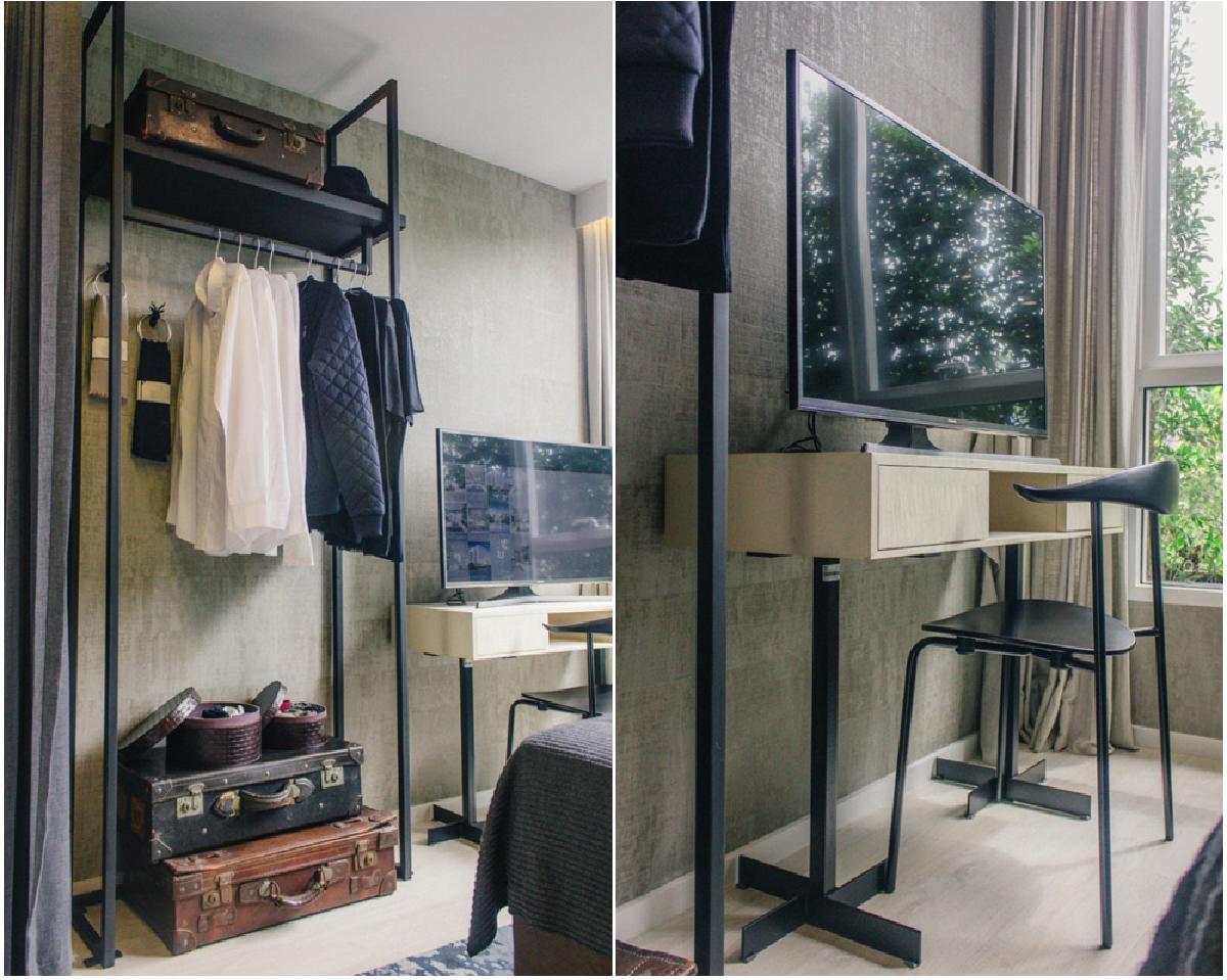 ปลายเตียงสามารถมองได้เป็นสองส่วนคือ โต๊ะทำงานที่ถูกจัดวางไว้ใกล้กระจก เมื่อนั่งทำงานก็สามารถมองบรรยากาศวิวข้างนอกได้ช่วยพักสายตา ในขณะเดียวกันก็อาจจะทำให้การทำงานขาดสมาธิได้เช่นกันหากหน้าต่างหน้าติดกับวิวที่ไม่สงบ ส่วนของราวแขวนเสื้อผ้าเป็นสไตล์ลอฟท์ที่เน้นการใช้งานแบบเปิดหยิบใช้งานง่าย