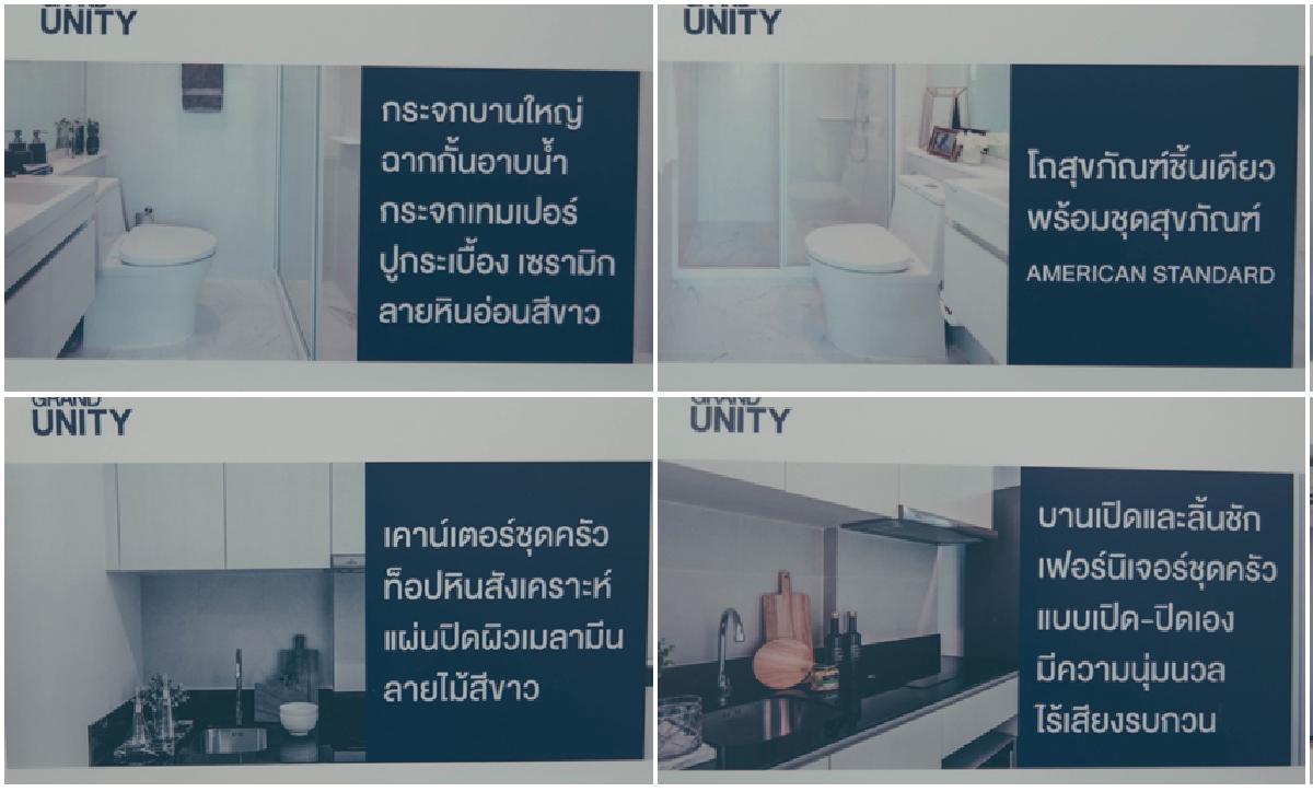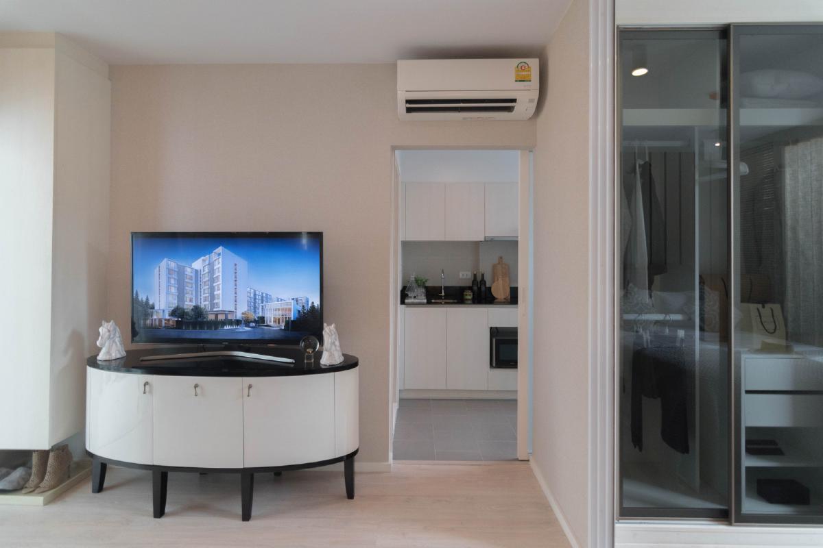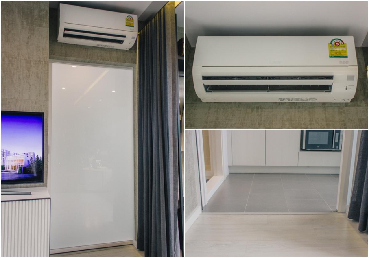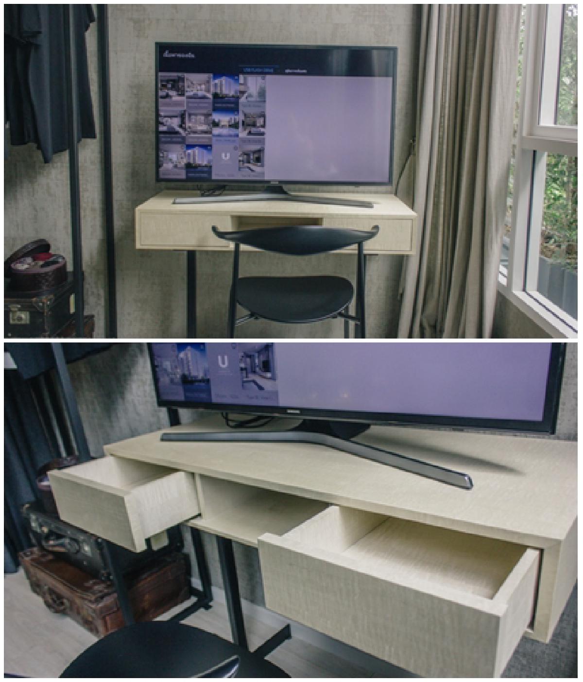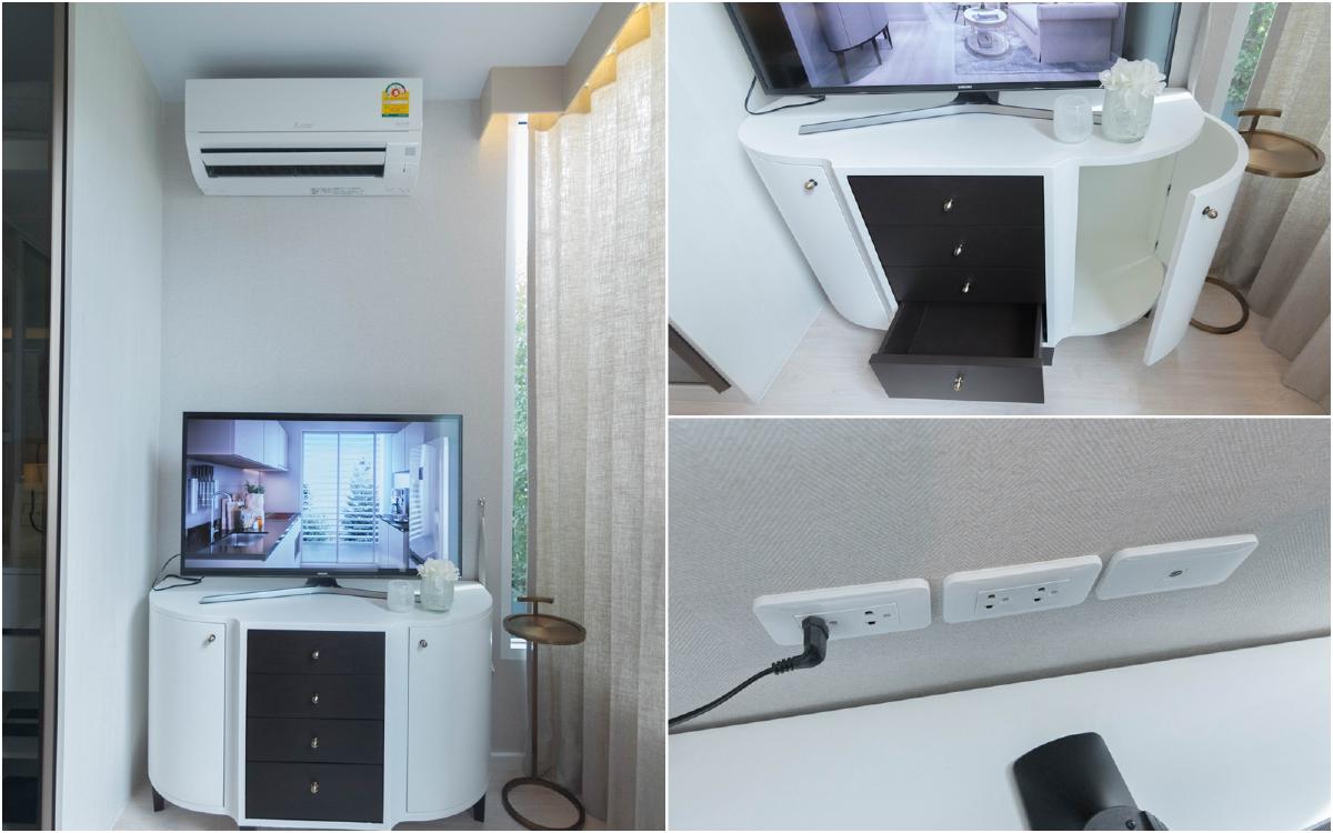 ในส่วนปลายเตียงของห้องตัวอย่างห้องนี้ โครงการใช้วางชั้นวางทีวีแทนโต๊ะทำงาน ด้านหลังมีเต้าเสียบและช่องสัญญาณทีวีให้ (โต๊ะทำงานใช้ร่วมกับโต๊ะอาหารที่วางใกล้กับโซฟาในห้องนั่งเล่น) ซึ่งผู้อาศัยสามารถปรับเปลี่ยนได้ตามสไตล์การอยู่อาศัยของแต่ละคน ส่วนด้านบนเป็นเครื่องปรับอากาศ Mitsubishi ขนาด 9,000 BTU