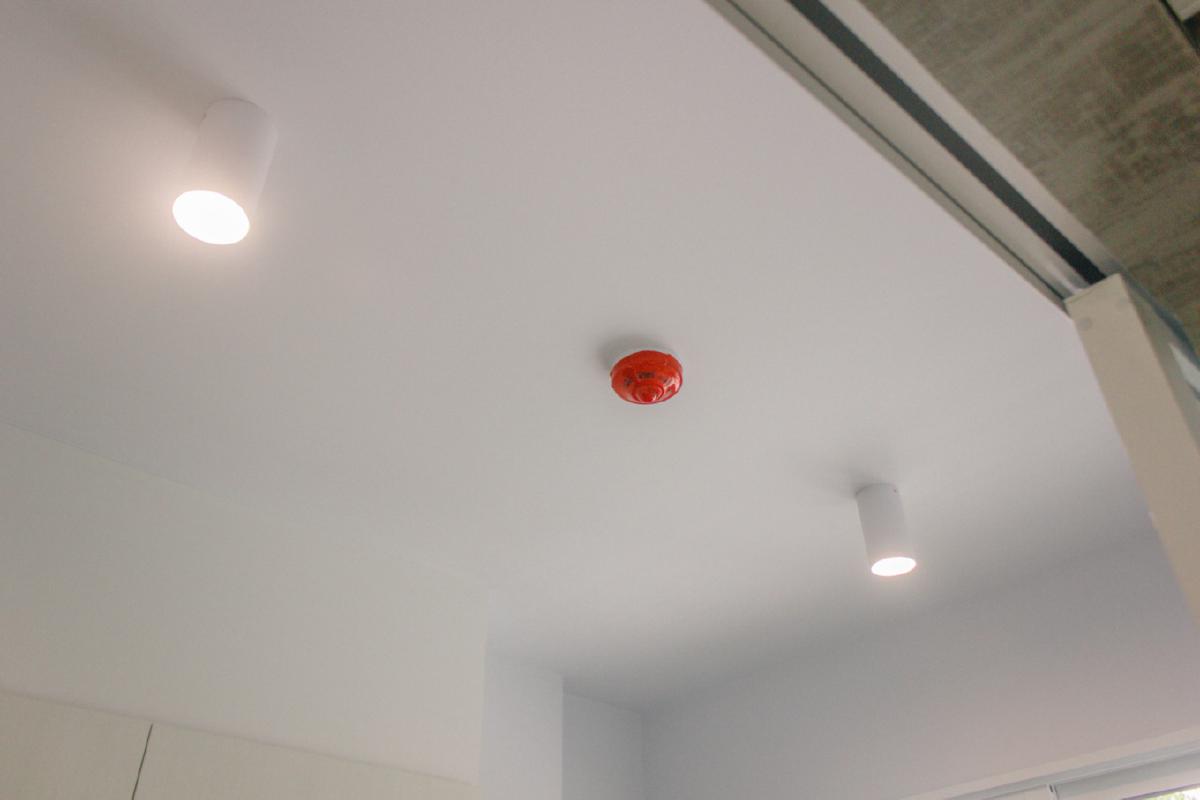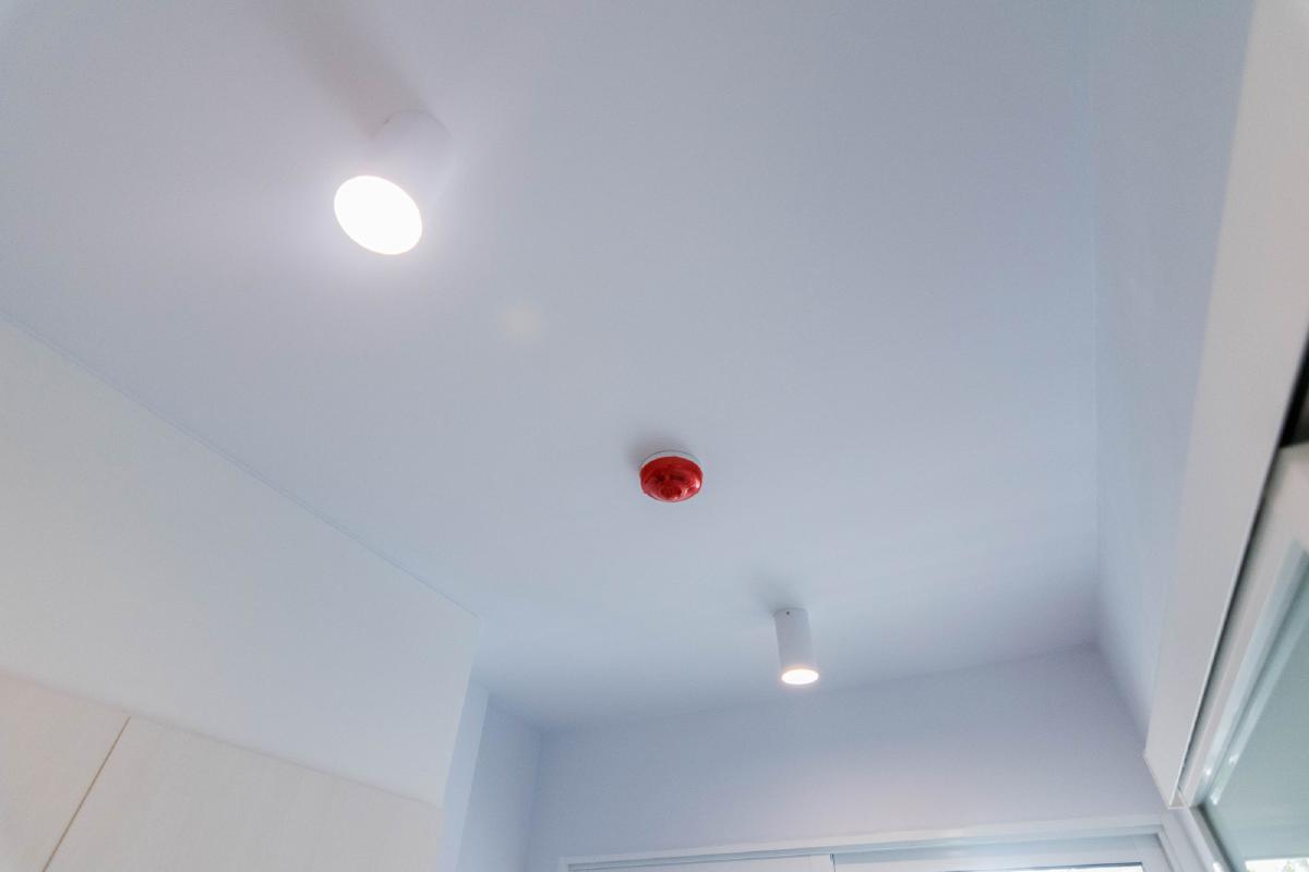 ไฟในห้องครัวเป็นไฟดาวน์ไลท์ทรงกระบอก 2 ดวงพร้อมกับอุปกรณ์แจ้งเตือนเหตุไฟไหม้ 1 ตัว