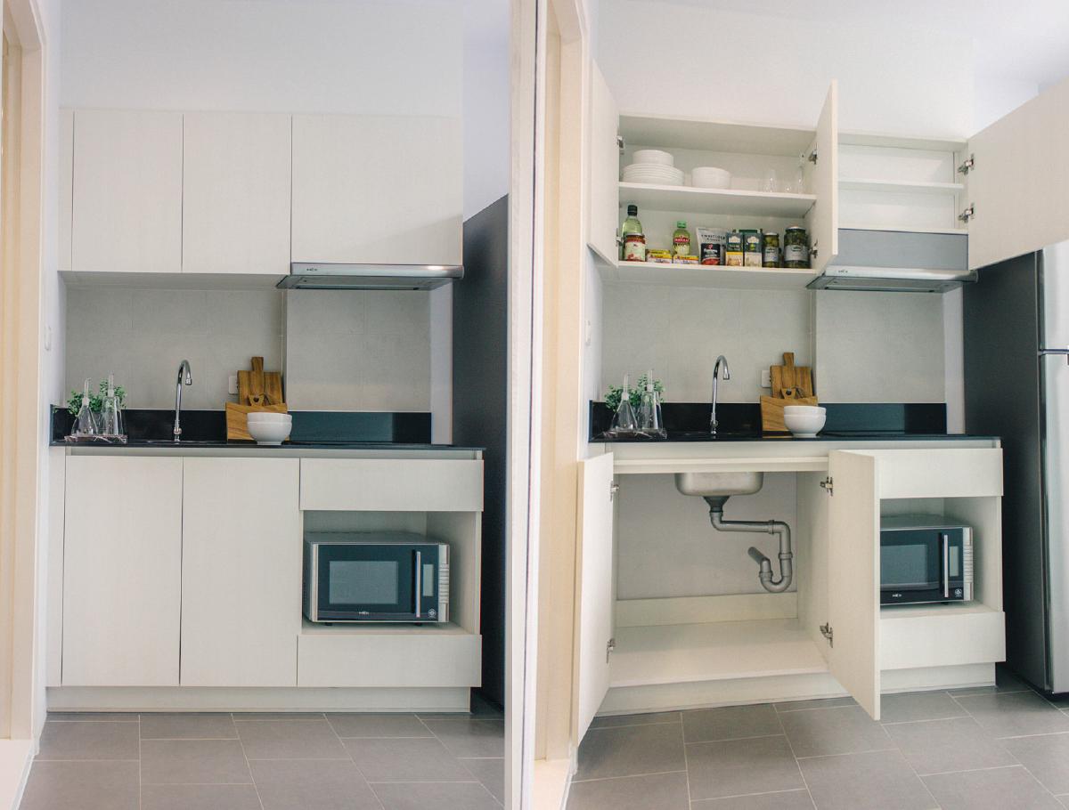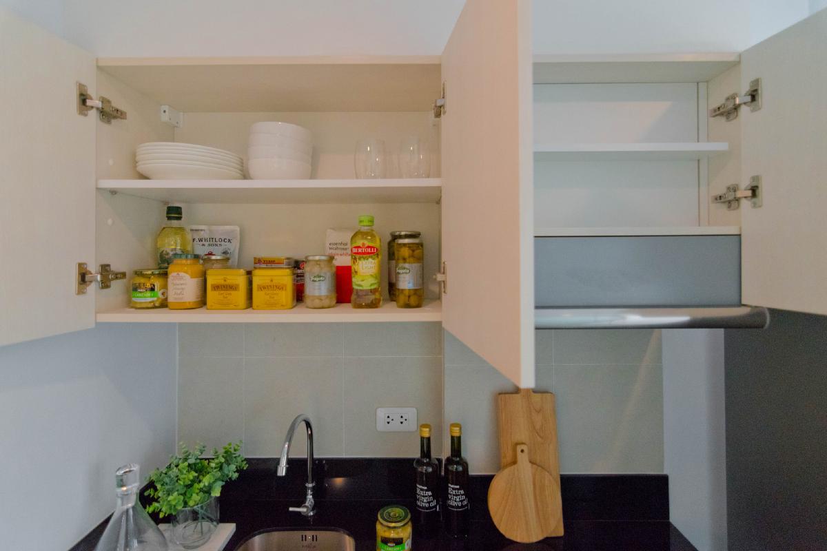 ชุดครัวด้านบนเป็นชั้นเก็บอุปกรณ์และเครื่องปรุงสำหรับการประกอบอาหารฝั่งละ 2 ชั้นรูปแบบเหมือนห้องขนาด 26 ตร.ม. มีเครื่องดูดควัน (Hood) แถมมาให้
