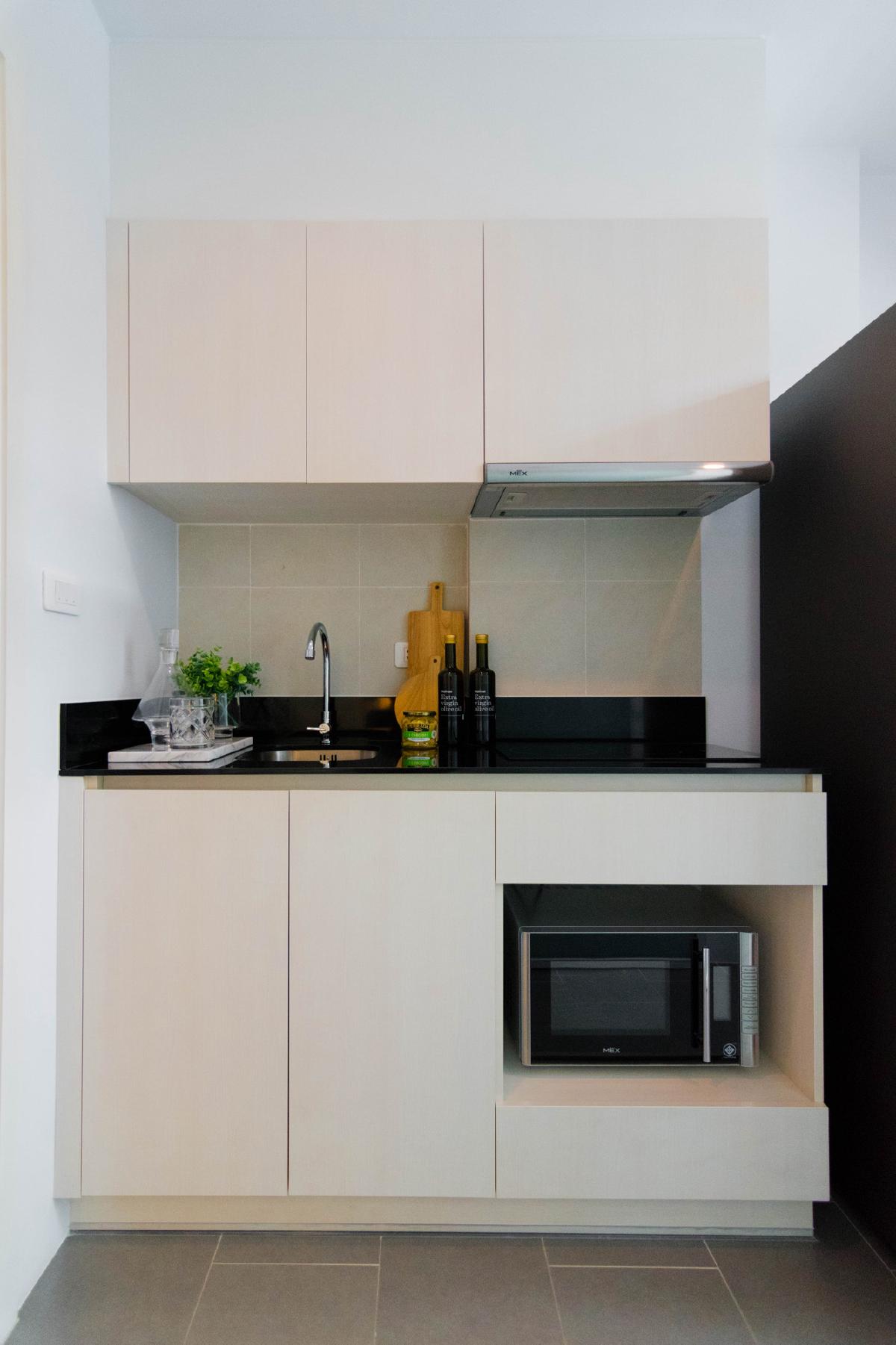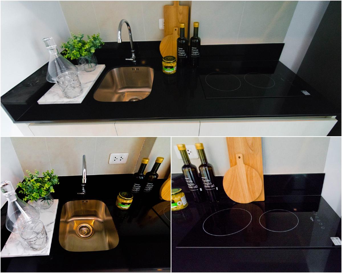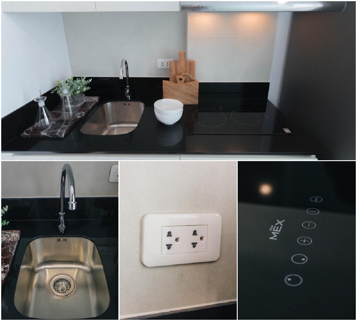 เคาน์เตอร์ครัวมี 2 โซน คือ อ่างล้างจาน และเตาไฟฟ้า 2 หัว ผนังมีเต้าเสียบปลั๊กให้ ส่วนวัสดุ TOP ครัวเป็นหินสังเคราะห์