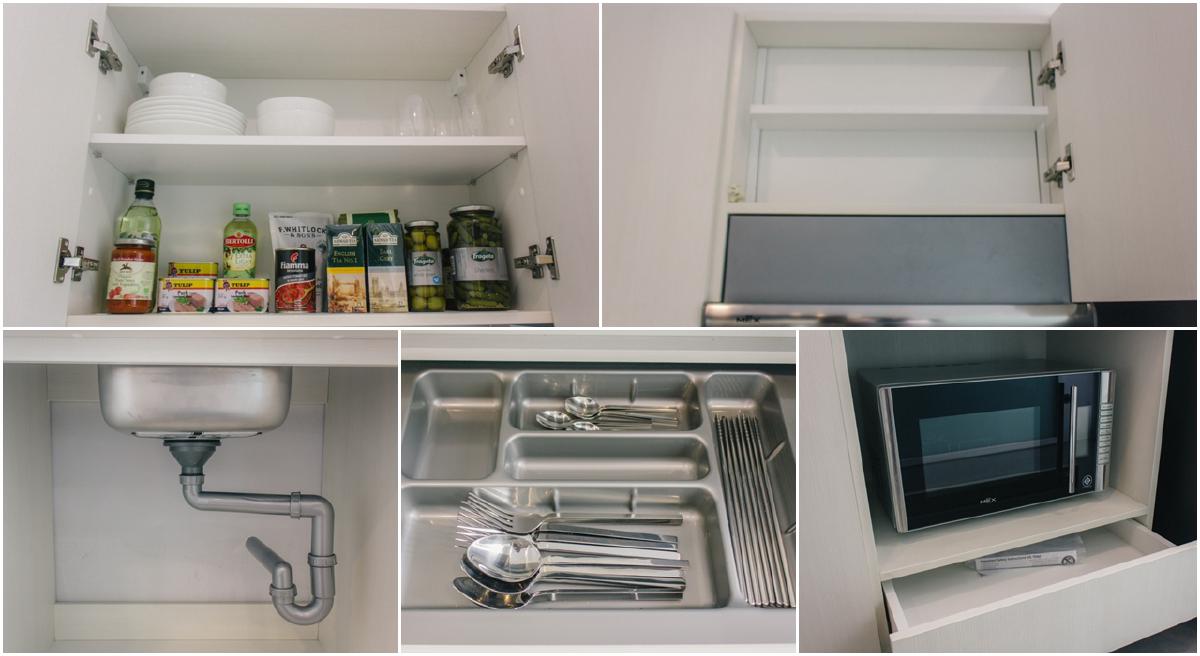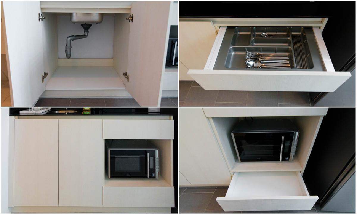 ด้านล่างเป็นตู้เก็บของ ลิ้นชักใส่ช้อน - ส้อม ฯลฯ และช่องวางไมโครเวฟขนาด 56x40 ซม. ข้างๆ ของเคาน์เตอร์ครัวเป็นตู้เย็น ซึ่งขนาดของช่องวางตู้เย็นกว้าง 80 ซม. สามารถวางตู้เย็นได้อย่างพอดีมีช่องว่างเล็กน้อยสำหรับการระบายอากาศและทำความสะอาดพื้น