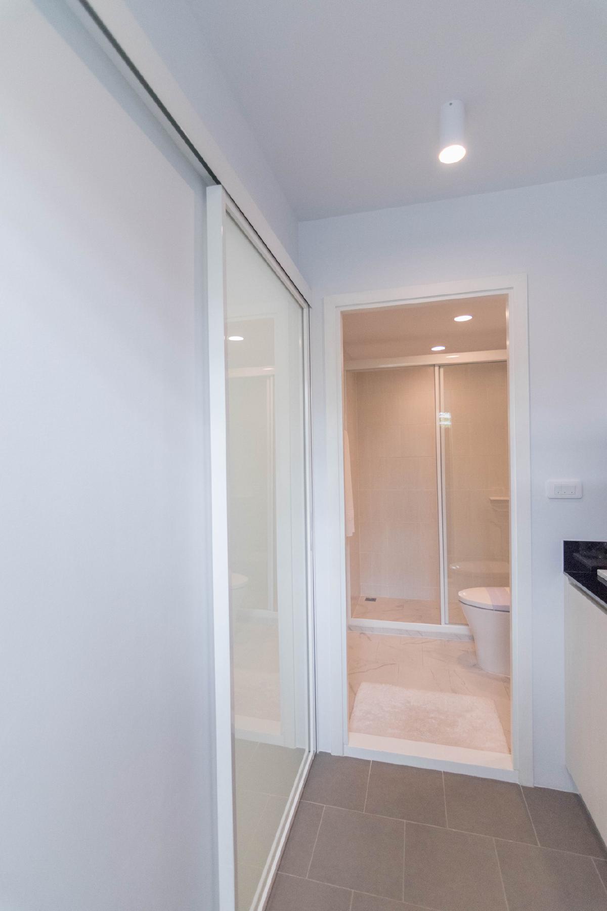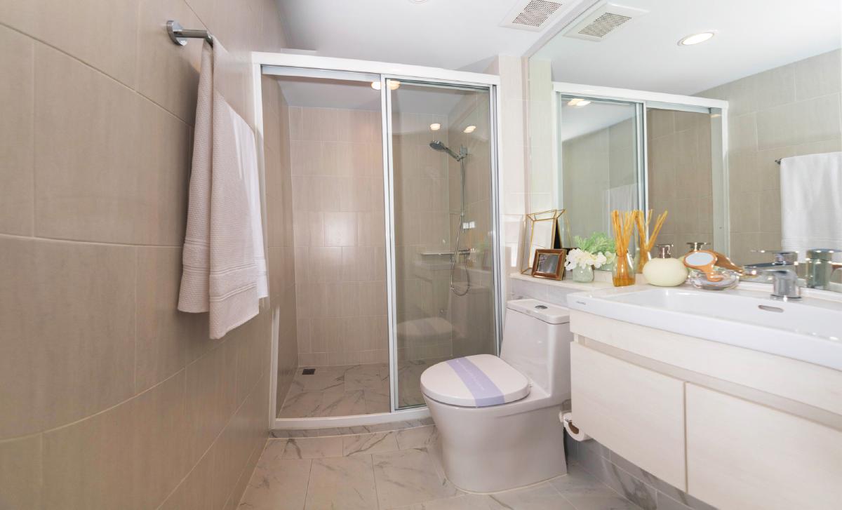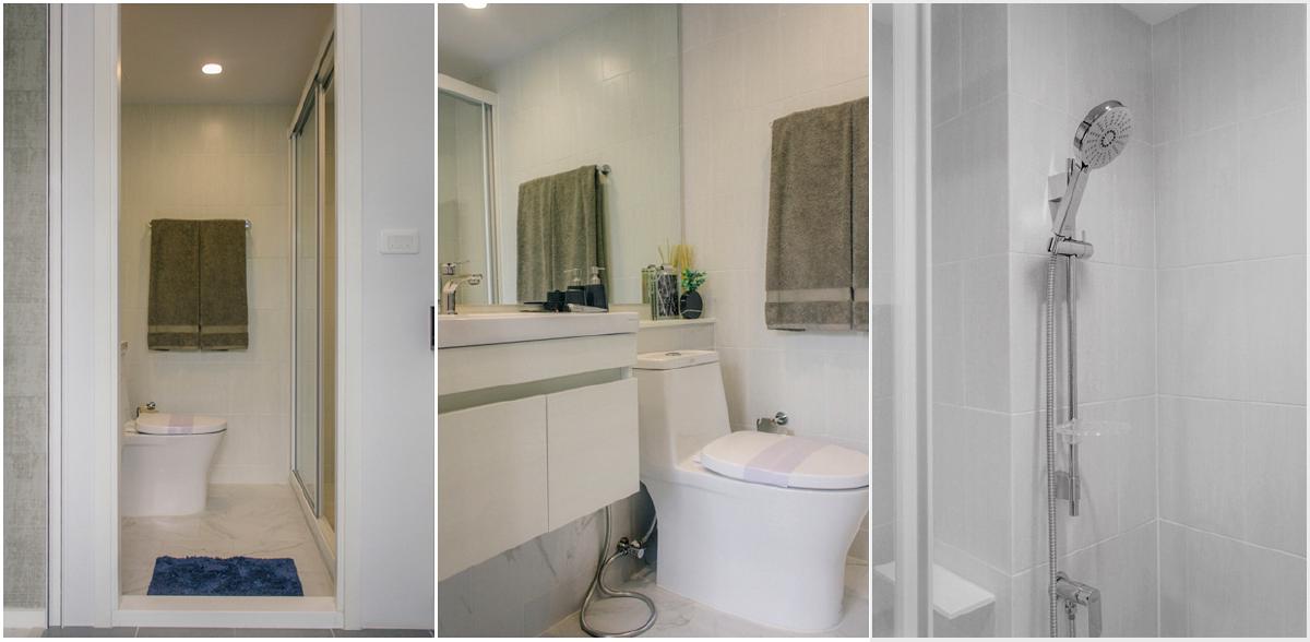 ด้านในห้องน้ำค่อนข้างกว้างไม่เหมือนห้องแรก อ่างล้างหน้าอยู่ฝั่งขวามือ กระจกกว้างเต็มผนังสูงถึงชนเพดาน ราวแขวนผ้าอยู่ฝั่งซ้ายมือยาว 60 ซม. ด้านหน้าเป้นห้องอาบน้ำกั้นด้วย Shower Box เป็นกระจกบานเลื่อนอย่างหนา กรอบประตูเป็น Aluminium Powder Code เมื่อเลื่อนไปมามีความแข็งแรงไม่สั่นหรือเบาเหมือนกับฉากกั้นห้องอาบน้ำในแบบเก่าๆ