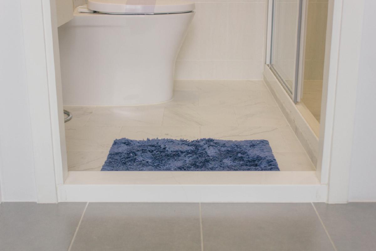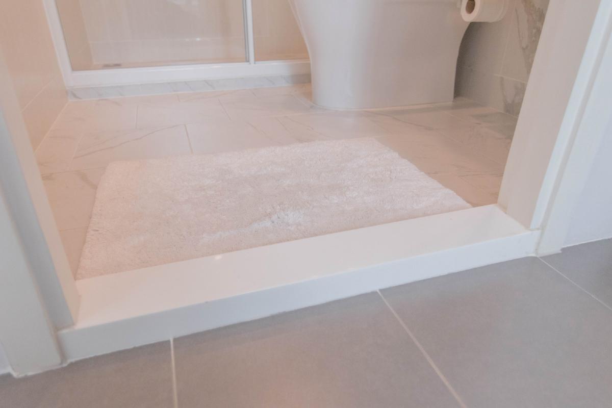 ธรณีสูง 10 ซม. ประตูเป็นประตู UPVC ตัวจับเป็นแบบลูกบิด พื้นห้องน้ำปูด้วยกระเบื้องลายหินอ่อนขนาด 30x30 ซม.