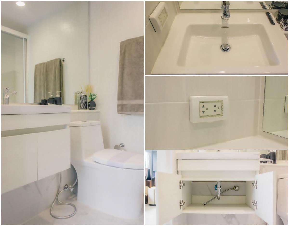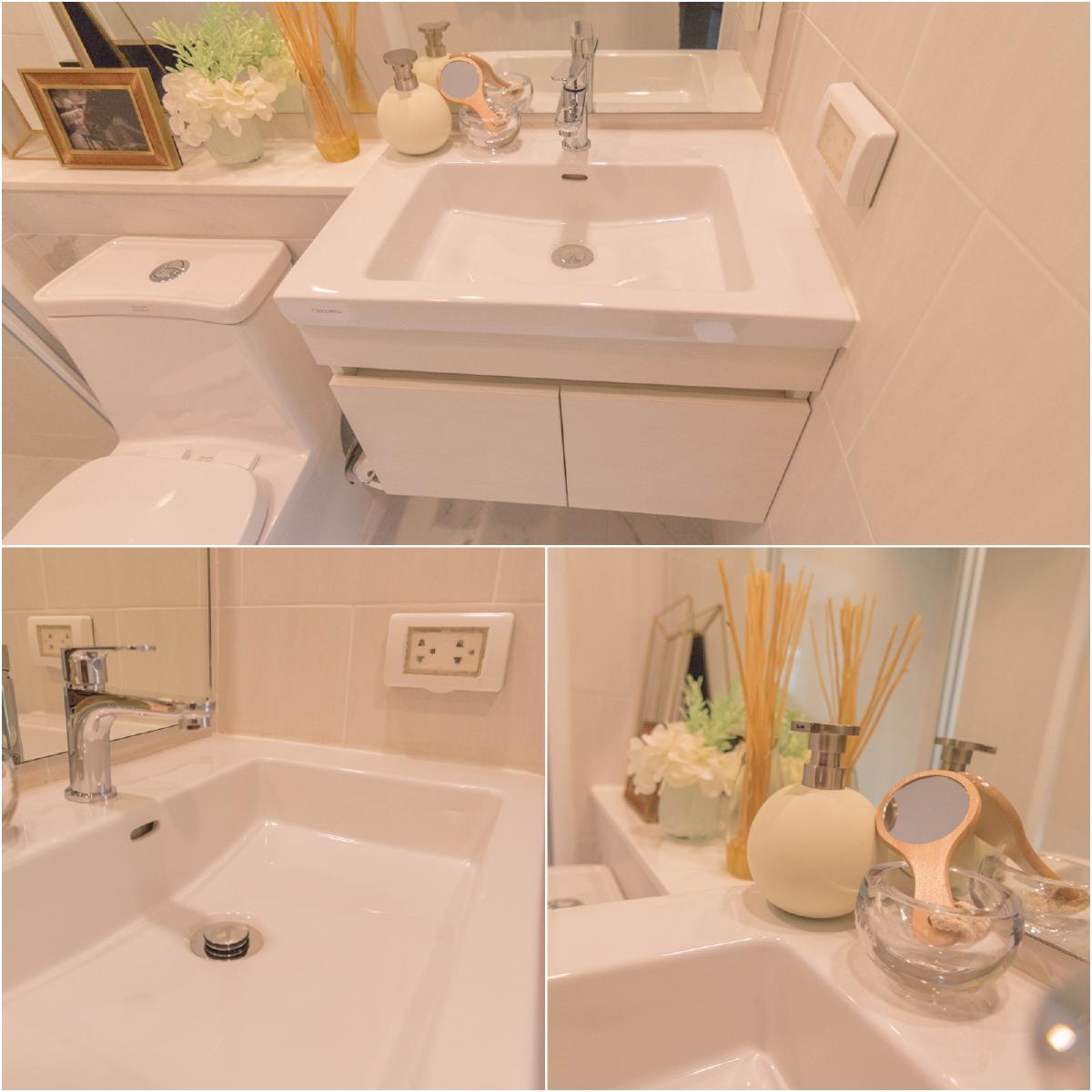 อ่างล้างหน้ามีขนาด 60x42 ซม ขอบอ่างกว้างสามารถวางของได้ มีเต้าเสียบปลั๊กขวามือพร้อมฝาครอบป้องกันน้ำกระเด็นโดน ด้านล่างอ่างล้างหน้าเป็นตู้เก็บของ เหนือโถสุขภัณฑ์เป็นเคาน์เตอร์ยื่นออกมา 15 ซม.