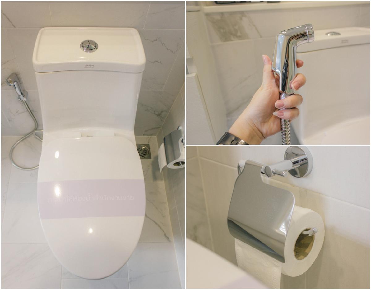 โถสุขภัณฑ์เป็นของ American Standard หัวฉีดชำระเป็นแบบโครเมียมมีความแข็งแรง ไม่เปราะหักง่าย และไม่เกิดสนิม