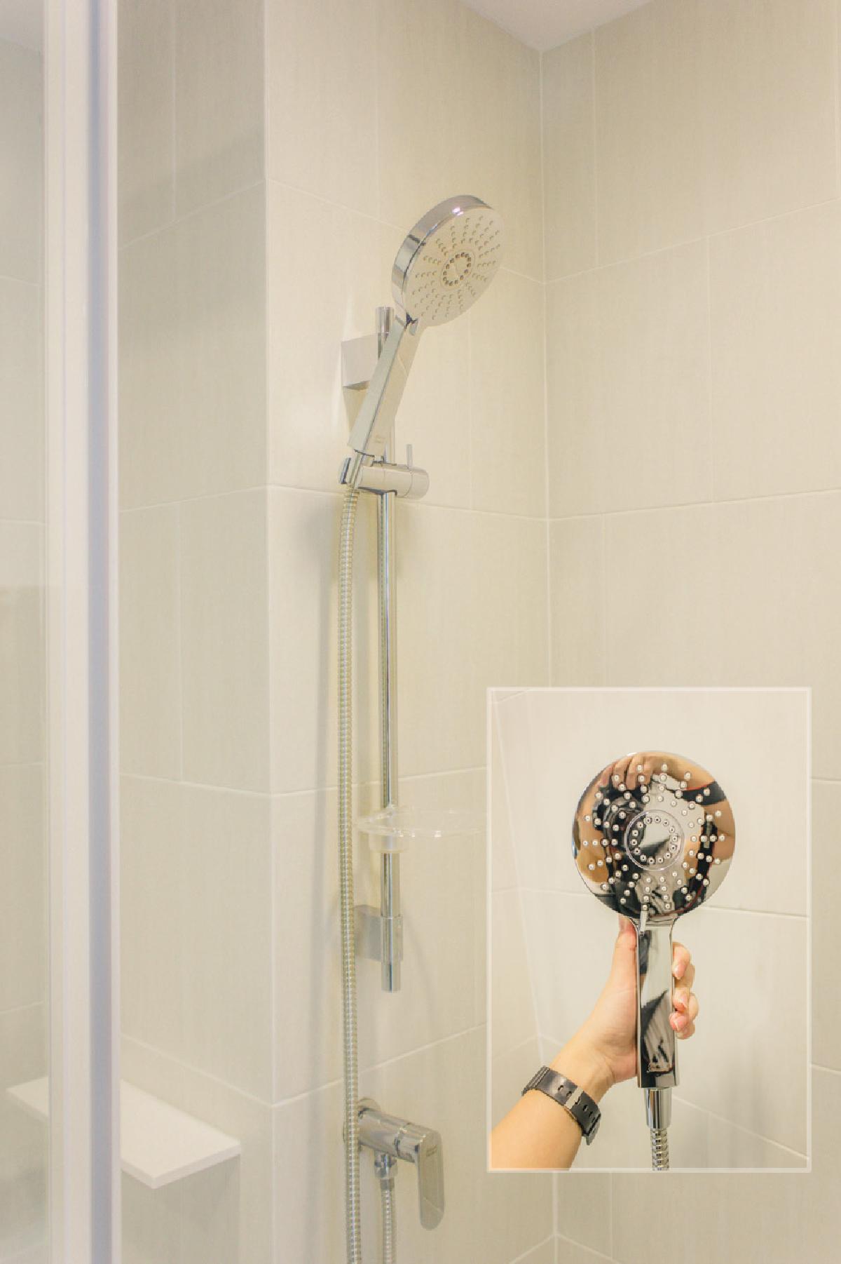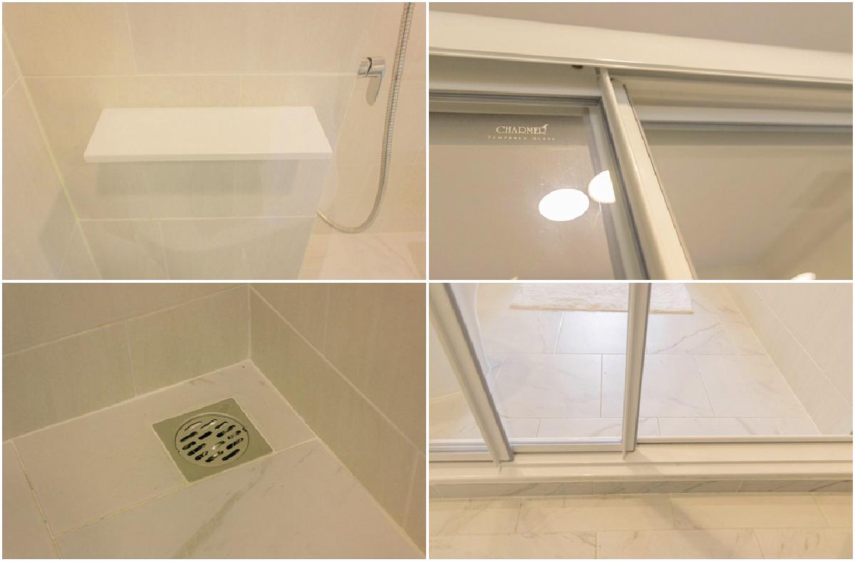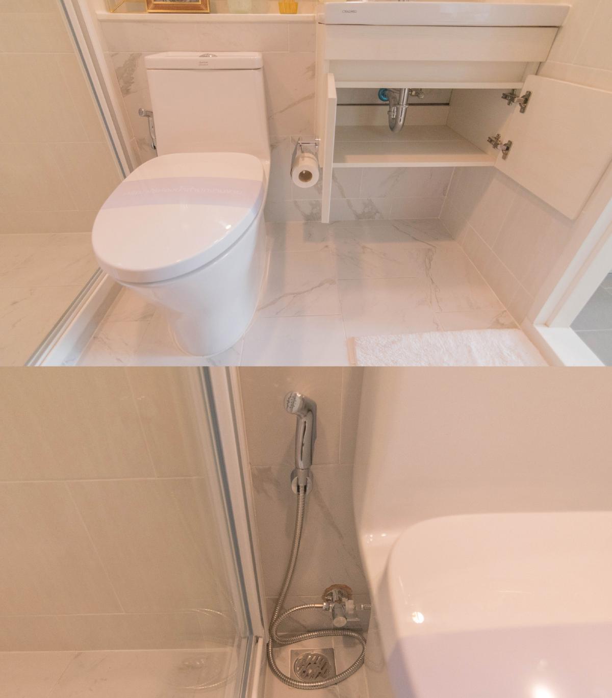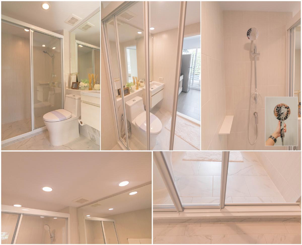 ห้องอาบน้ำค่อนข้างกว้างและเป็นสัดส่วน ธรณีกั้นประตูสูง 10 ซม. ฝักบัวเป็นแบบ hand shower สามารถปรับระดับความแรงของน้ำ มีแท่นแขวนที่สามารถปรับระดับความสูงต่ำของฝักบัวได้ ไฟห้องน้ำเป็นไฟดาวน์ไลท์แบบหลุมจำนวน 3 ดวง