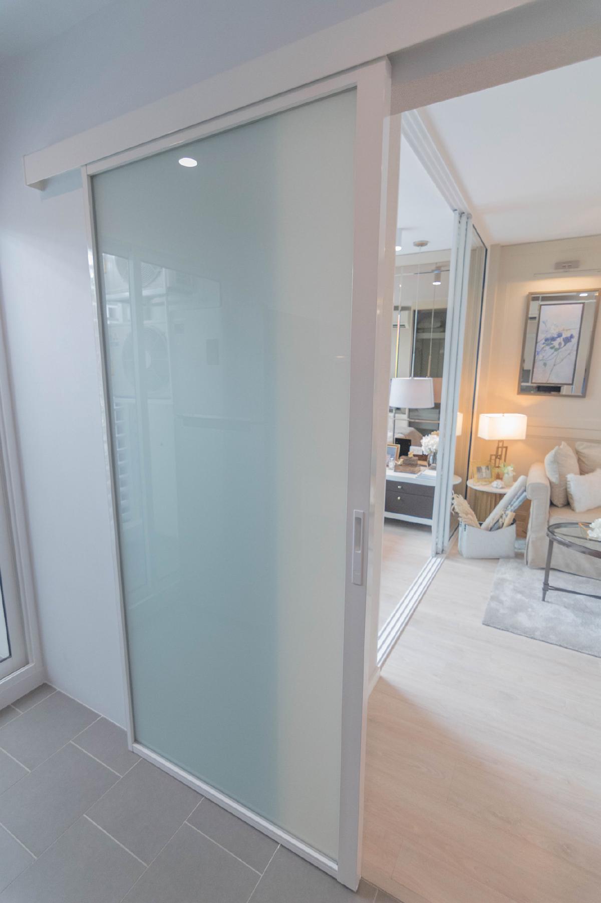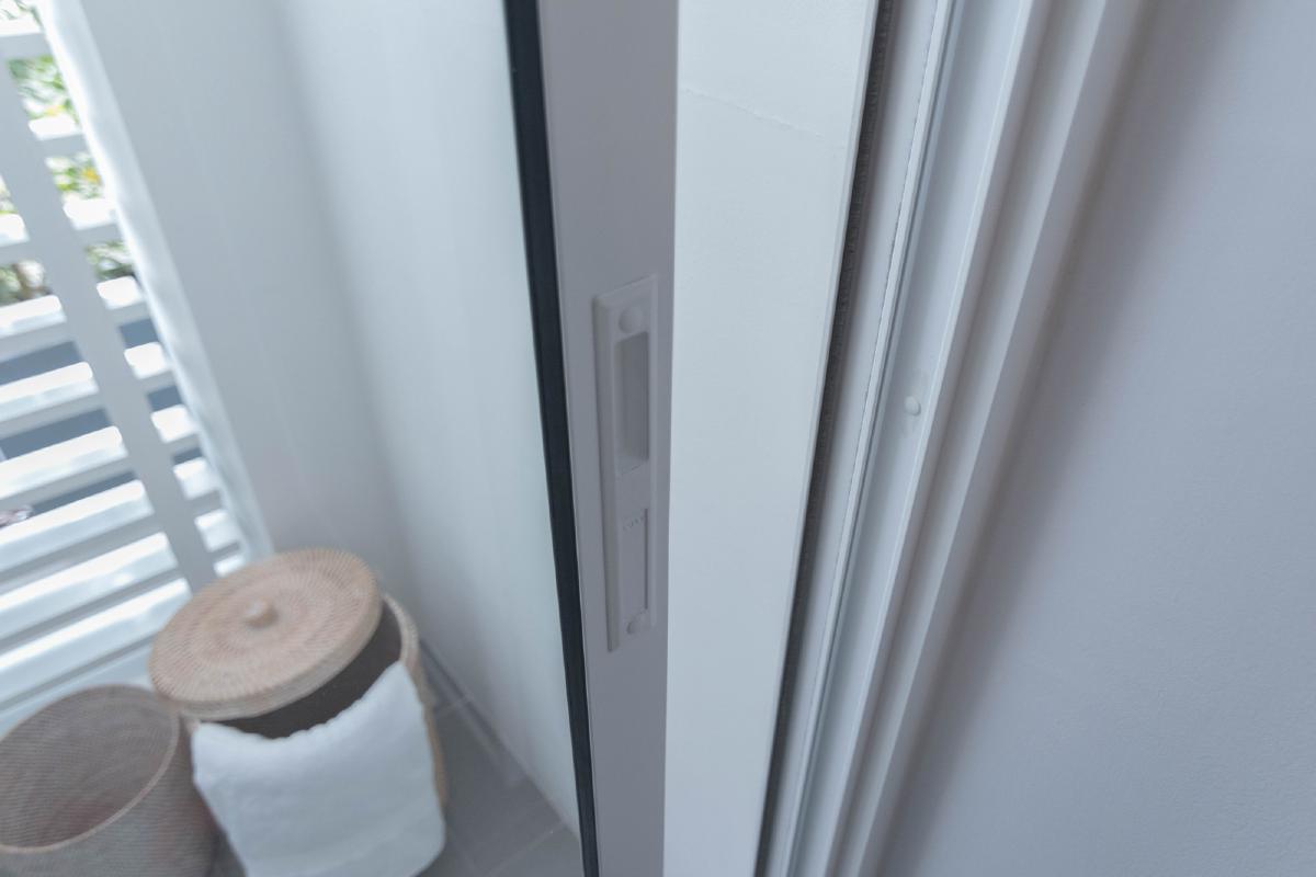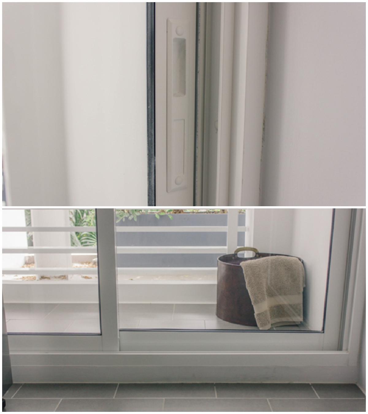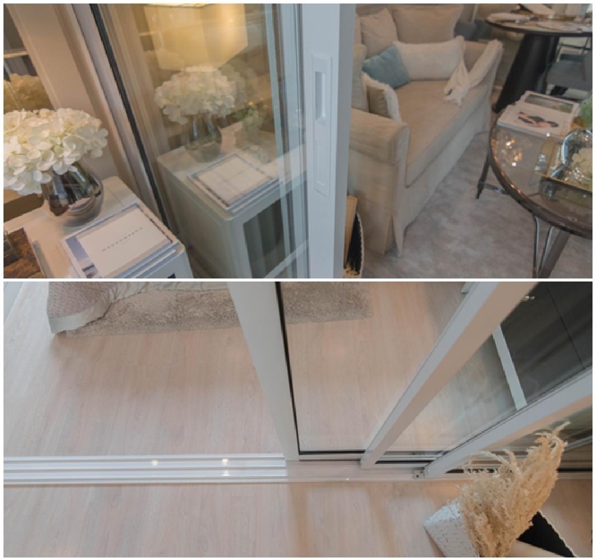 ประตูเป็นกระจก Laminated Glass กระจกเขียวตัดแสง กรอบบานเลื่อนเป็น Aluminium Powder Code สีขาว ธรณีประตูสูง 10 ซม. ตัวจับประตูเป็นแบบเซาะร่องแต่ไม่มีตัวล็อกเนื่องจากเป็นระเบียงแบบปิด