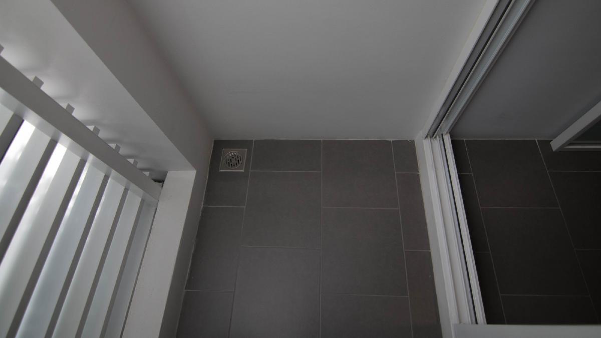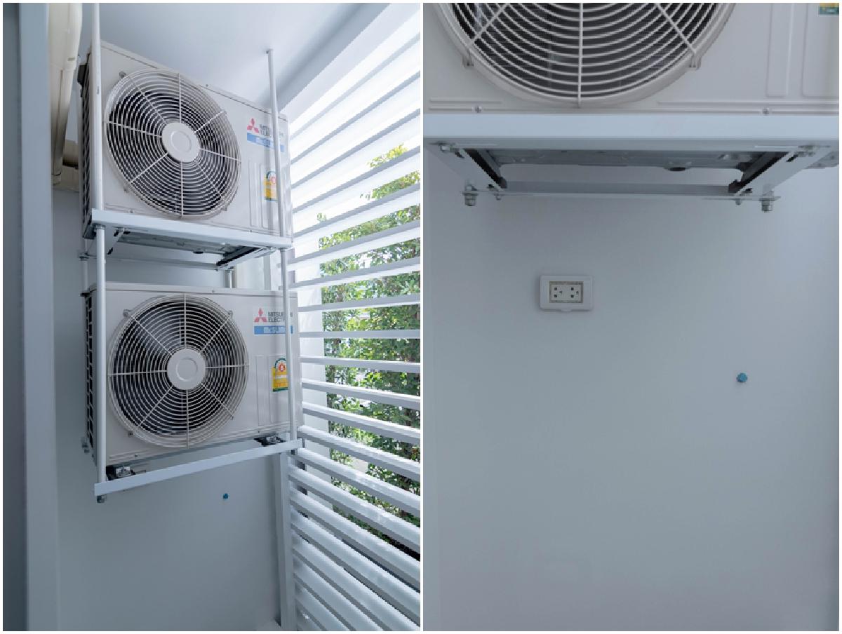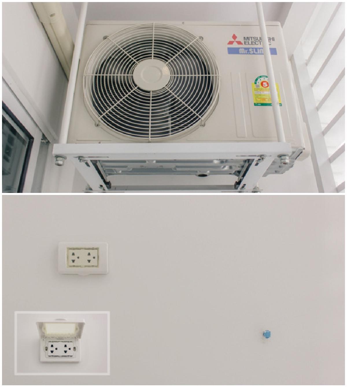 คอมเพรสเซอร์มี 2 เครื่องติดตั้งแบบแขวนหันเข้าด้านข้าง ผนังด้านล่างเป็นเต้าเสียบปลั๊กไฟพร้อมฝาครอบ ส่วนระเบียงเป็นแบบระแนง Aluminium Grill สีขาว เหมือนกับห้องแรก เน้นการใช้งานเป็นส่วนตัวและสามารถตากผ้าได้ บังสายตาจากผู้คนด้านนอก