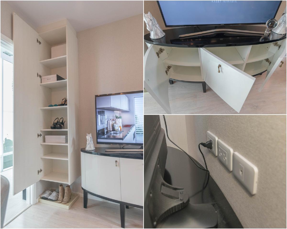 สำหรับตู้เก็บรองเท้าและทีวีจะอยู่ซ้ายมือใกล้กับประตูทางเข้าของห้อง ซึ่งทางโครงการ คอนโด ยู เกษตร-นวมินทร์ (Condo U Kaset-Nawamin) แถมให้กับผู้ซื้อ 04 เมื่อเปิดดูจะเห็นว่าด้านในตู้เก็บรองเท้ามีชั้นวางค่อนข้างเยอะ ประมาณ 7 ช่อง รวมพื้นที่วางใต้ตู้เป็น 8 ช่องด้วยกัน เหมาะสำหรับคนที่ชอบซื้อรองเท้าหรือสะสมรองเท้าเยอะๆ นอกจากจะเก็บรองเท้าแล้วยังสามารถปรับไปใช้อย่างอื่นได้อีกด้วยเช่น เก็บของใช้จุกจิก หรือเครื่องมือช่าง ส่วนชั้นวางทีวีด้านในเป็นตู้เก็บของ ผู้อาศัยสามารถเก็บของได้ เช่น อัลบั้มรูป นิตยสาร หรือกล่องเก็บของเล็กๆ ส่วนทีวีที่เห็นในห้องตัวอย่าง เป็นทีวีขนาด 32 นิ้ว
