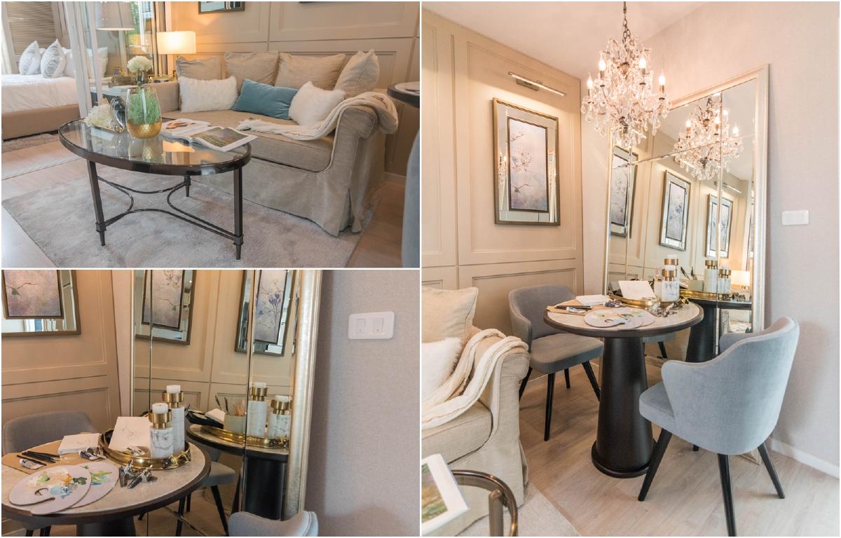 อีกมุมของโซนนั่งเล่นจะเห็นว่าโครงการมีนำโต๊ะมาแต่งคู่กับโซฟาซึ่งอาจจะเห็นว่าทำให้ทางเดินเข้าห้องดูคับแคบไปเลย ดังนั้นหากใครต้องการจัดห้องให้ดูกว้างโต๊ะอาจจะไม่จำเป็นเท่าไรนัก สามารถตัดออกไปได้เลย