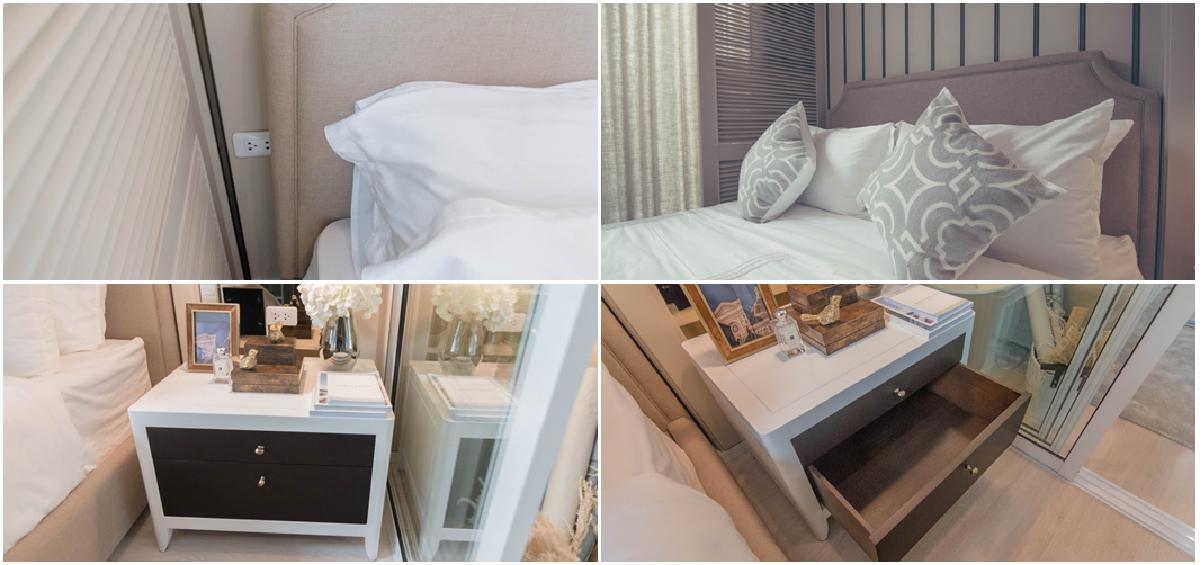 เตียงในห้องตัวอย่างมีขนาด 5 ฟุต หรือจะใส่ 6 ฟุตก็ทำได้แต่อาจจะต้องตัดชั้นวางข้างหัวเตียงออกไปเพื่อปรับพื้นที่