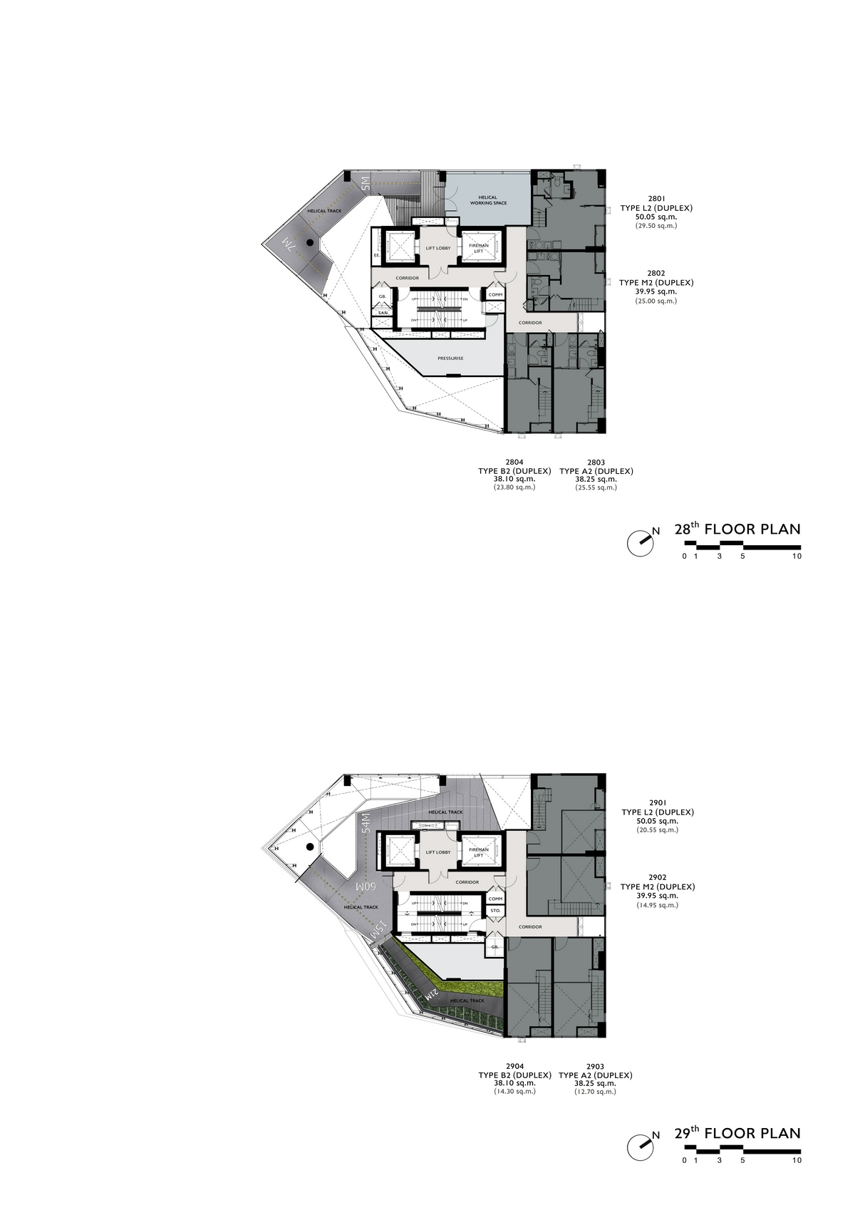- และเมื่อขึ้นไปบนชั้น 29 ก็จะเป็นพื้นที่ชั้น 2 ของห้อง Duplex และเส้นทางของ Helical Track ทางวิ่งออกกำลังกายที่เชื่อมต่อขึ้นมานั่นเอง